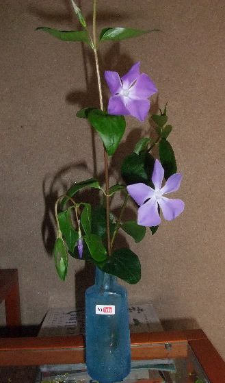 先日、今季初めて咲いたツルニチニチソウを切って生けた。 そのときは一輪だったけれど、こうして2輪になった。 ツルニチニチソウはたぶん雑草の部類だろう。誰が雑草か雑草でないかを決める権利を持っているのかは知らない。僕は今うちの被災跡地のカラスノエンドウとは戦っているから僕にはカラスノエンドウは雑草だ。でも僕にはツルニチニチソウは雑草ではない。強いし花は可憐で綺麗だしグランドカバーになるから好きなのだ。でも妻はツルニチニチソウと戦うように僕に強要する。強くてジャングルのようになるからと言う。僕はジャングルにしたいのだ。だから全く考えが違うし、好みも違うことになる。 何年か前までは僕は実家をツルニチニチソウのジャングルにしていた。何年かかけてやっとイメージどおりになってきたのだった。でもそれは妻には好ましくない解決されるべき問題だった。 結局僕は不承不承にツルニチニチソウと戦って、ジャングルは過去になっていった。でも強いからなくなりはしない。なくなってほしいと思われているのに生えてきて咲いてくるから僕にはそれはそれで大事なので、匿うわけにはいかないからちょっと生けてみてプチ満足しているわけなのだ。 男は結局黙ってしまうことが多い。結局は黙ってしまって、できることなのだったら言うとおりしておこうということになる。 ここにも女性支配社会であるという検証が可能である。