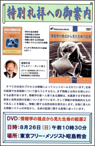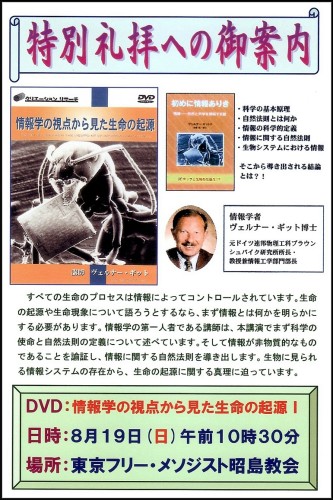 「初めに情報ありきか物理法則ありきか」 甲斐慎一郎 ヨハネの福音書、1章1~5節 一、初めに物理法則ありき 「車いすの天才科学者」として有名な英ケンブリッジ大のスティーブン・ホーキング博士は、「二〇一〇年九月に『ホーキング、宇宙と人間を語る』を出版し、たちまちベストセラーになりました。日本の新聞にも、ホーキングが『宇宙は神によって創られたのではなく、物理法則によって自然に作られるのだ』と書いていることに対して、欧米ではキリスト教関係者から強い反発を受けているというニュースが流れました」(『ホーキング、宇宙と人間を語る』258、259頁、エクスナレッジ、2011年)。 ホーキング博士は、次のように述べています。 「この世界には完全なる法則の集合があり、現在の宇宙の状態を知ることができれば、今後宇宙がどのように発展するのかを予言することができる、という考え方です。このような法則はどの場所でもどの時刻でも成り立つべきで、そうでなかったらそれは法則ではありません。例外や奇跡もありません。神でも悪魔でも宇宙の発展に干渉することはできないのです」(『ホーキング、宇宙と人間を語る』239頁、エクスナレッジ、2011年)。 ホーキング博士は、この本の出版に関して次のような謝辞を述べています。 「宇宙は偉大な設計図によって創造されました。そして本も、その設計図に従って書かれるのです。しかし、宇宙は無から生まれましたが、本は無から自発的に現れることはあり得ません。宇宙が創られるために創造主は必要ではありませんでしたが、本が出版されるためには制作者が必要です。その役割は著者だけが果たすのではありません。編集者、デザインをした人、校正をした人、図版の制作者、絵を書いた人、個人秘書、コンピューター補佐役の名前を挙げて感謝しています」(『ホーキング、宇宙と人間を語る』255~257頁、エクスナレッジ、2011年)。 二、初めに情報ありき 現代は、ITの時代です。ITとは「Information Technology」すなわち「情報技術」ということです。情報がなければ、何も考えられず、また何も動きません。21世紀になって、人類は「情報」ほど大切なものはないことがわかったのです。ところが聖書は、初めから「情報」が何よりも大切であることを教えています。 ヨハネは、「初めにことばがあった。ことばは神とともにあった。ことばは神であった。この方は、初めに神とともにおられた。すべてのものは、この方によって造られた」と記しています(1~3節)。「ことば」は心の表現、言い換えれば、人格を持つ者の表現です(マタイ12章34節)。 情報学者のヴェルナー・ギット博士は、この「初めにことばありき」というヨハネのことばを用いて「初めに情報ありき」という本を出版しています。すなわち「ことば」は、情報にほかなりません。 聖書は、「家はそれぞれだれかが建てるのですが、すべてのものを造られた方は、神です」と記しています(ヘブル3章4節)。 ケン・ハム氏は、「背後に知性の存在を指し示すものの例として、建物、ラシュモア山の彫刻、車を挙げ、これらは決して自然にはできません。知性のある誰かが計画して作ったから存在するのです」と述べています。 「ヒトの遺伝情報を読んでいで、不思議な気侍ちにさせられることが少なくありません。これだけ精巧な生命の設計図を、いったいだれがどのようにして書いたのか。もし何の目的もなく自然にできあがったのだとしたら、これだけ意味のある情報にはなりえない。まさに奇跡というしかなく、人間業をはるかに超えている。そうなると、どうしても人間を超えた存在を想定しないわけにはいかない。そういう存在を私は『偉大なる何者か』という意味で十年くらい前からサムシング・グレートと呼んできました」(村上和雄『生命の暗号』198頁、サンマーク出版、1997年)。 情報学者のヴェルナー・ギット博士は、宇宙には「情報」と「エネルギー」と「物質」があり、情報がエネルギー(物理法則)を造り出し、エネルギーが物質を形造ると述べています。情報がなければ、エネルギー(物理法則)はなく、エネルギーがなければ、物質は存在しません。 「初めに情報ありき」と「初めに物理法則ありき」のどちらが正しいでしょうか。私たちは、どちらを信じるでしょうか。甲斐慎一郎の著書→説教集東京フリーメソジスト昭島キリスト教会
