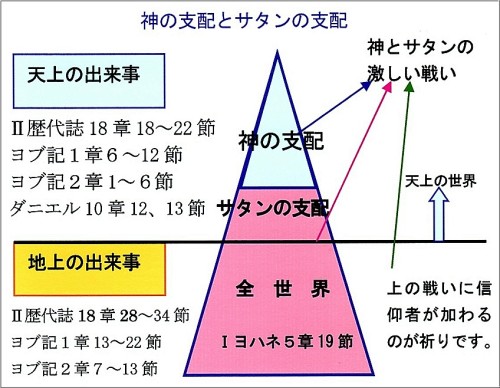 「神の支配とサタンの支配」インターネットのテレビ局CGNTV(Christian Global Network Television)の番組「みことばに聞く」に当教会の牧師が出演しました。以下のURLをクリックすると見ることができます。2012年8月3日放映「キリスト教の信仰」「神の支配とサタンの支配」 甲斐慎一郎 ヨブ記、1章6~12節 一、サタンは、この世の神であり、世全体は悪い者の支配下にあります パウロは、サタンのことを「この世の神」と呼んでいます(第二コリント4章4節)。またヨハネは、「世全体は悪い者の支配下にある」(第一ヨハネ5章19節)と述べています。そしてサタン自身は、キリストを誘惑する時、「この、国々のいっさいの権力と栄光......は私に任されている」と主張しています(ルカ4章6節)。 上の図の桃色の台形は、世全体がサタンの支配下にあることを示したものです。 二、しかし神は、その上にあって、すべてのものを支配しておられます 世全体がサタンの支配下にあることは、一面において事実ですが、それがすべてではありません。神はその上にあってサタンさえも支配しておられる方です。 上の図の青い線の三角形は、そのことを示したものです。 世全体は、サタンの支配下にありますが、神はその上にあってサタンさえも支配しておられることは、斥候の派遣と人口調査の出来事において明白に記されています。 三、カデシュ・バルネアでモーセが斥候を派遣した出来事(民数記13章1、2節) カデシュ・バルネアは、神がイスラエル人に与えることを約束された「乳と蜜の流れるカナンの地」の南側の境界にある町です。モーセは、民に「主は、この地をあなたの手に渡されている。上れ。占領せよ」と言いました(申命記1章21節)。 ところが彼らは、モーセに「先に人を遣わし......その地を探らせ......報告を持ち帰らせよう」と言いました(同1章22節)。モーセにとってこのことは良いと思われたので、彼は各部族から一人ずつ、十二人の斥候を選んで、遣わしたのです(同1章23節)。 この申命記1章の記事がカデシュから斥候を派遣した時の真相なのでしょう。民数記の13章1、2節では、主がモーセに命じて人人を遣わされたことが記されていますが、これは、恐らく「モーセが神の許可を得て、これを承諾した」(A・イーダーシャイム)ことを教えているのではないでしょうか。 四、ダビデがサタンの誘惑に負けて人口調査をした出来事(第二サムエル24章1節) その「当時、国には多くの問題があったらしい(1節)」(A・M・レンウィック)。そのために「再び主の怒りが、イスラエルに向かって燃え上がった」のです(1節)。 ところがダビデは、その問題を解決するよりもイスラエルを強力な国家とするために軍務につくことができる兵士が何人いるかという人口調査をすることを考えていました。それで「神はダビデの性質をためすため、彼が誘惑されるままにしておかれた」(A・M・レンウィック)。すなわち「サタンがイスラエルに逆らって立ち、ダビデを誘い込んで、イスラエルの人口を数えさせた」のです(第一歴代21章1節)。ダビデは、このサタンの誘惑に負け、切々と訴えるヨアブの諌言を聞き入れず、人口調査をしたのです。 このように聖書は、サタンは、この世の神であり、世全体は悪い者の支配下にありますが、神は、その上にあって、すべてのものを支配しておられることを教えているのです。甲斐慎一郎の著書→説教集東京フリーメソジスト昭島キリスト教会