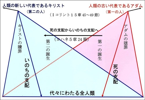 「人類の新しい始祖であるキリスト」 2015年3月30日インターネットのテレビ局CGNTV(Christian Global Network Television)の番組「みことばに聞く」に当教会の牧師が出演しました。2014年3月4日放映「苦難の意味するもの(1)」 「人類の新しい始祖であるキリスト」 甲斐慎一郎 ローマ人への手紙、5章12~21節 一、アダムの堕罪と死の支配 パウロは、キリストの贖罪による恵みが時間と空間を超越して全人類に及ぶというすばらしい事実を示すために、アダムの堕罪によって生じた罪とその結果である死が、時空を超越して全人類に及んでいるという厳粛な事実を述べています(12節)。 赤線の三角形は、人類の古い始祖であるアダムを頂点とし、そのアダムの堕罪によって世界に死がはいり、その死があらゆる人を支配して、代々にわたる全人類という底辺に及んだことを表しています。聖書は、アダムが罪を犯した時、すべての人は、彼の「腰の中にいた」(ヘブル7章10節)、すなわち彼の支配下にあったと教えています。 ヒトゲノム計画は、全世界の人々のDNAを調べ、ヒトゲノム(人の遺伝情報全体)のすべての配列を完成させました。ベンター博士と国立衛生研究所の科学者たちは、満場一致で「人種は、ただ一つしかない」と宣言しました。換言すれば、すべての人はアダムの「腰の中にいた」、すなわち彼の支配下にあったことが現代の科学で証明されたのです。 二、キリストの贖罪といのちの支配 青線の三角形は、人類の新しい始祖であるキリストを頂点とし、そのキリストの贖罪によって世界にいのちが与えられ、そのいのちがあらゆる人を支配して、代々にわたる全人類という底辺に及んだことを表しています。 パウロは、人類の新しい始祖であるキリストとキリストのひな型(模型)であるアダム(14節)とを比較して、「本物に対してひな型(模型)であるアダムの堕罪は、世界に死をもたらし、その死があらゆる人を支配して、代々にわたる全人類に及んでいるのです。とすれば、なおのこと、人類の新しい始祖であるキリストの贖罪は、どうして世界にいのちを与え、そのいのちがあらゆる人を支配して、代々にわたる全人類に満ちあふれないわけがあるでしょうか」とキリストとそのいのちの優越性を述べています(15、17節)。 DNA(遺伝情報)は、いのちの設計図(情報)、また生きているいのちであり、新しいいのちを形造り(複製し)ます。パウロは「私のうちに啓示(神の情報)」されるキリスト(ガラテヤ1章12、16節)と「私のうちに生きておられる」キリスト(同2章20節)と私の「うちに……形造られる」キリスト(同4章19節)について述べています。 聖書は、「血肉のからだがあるのですから、御霊のからだもあるのです。聖書に『最初の人アダムは生きた者となった』と書いてありますが、最後のアダム(キリスト)は、生かす御霊となりました。最初にあったのは血肉のものであり、御霊のものではありません。御霊のものはあとに来るのです。第一の人(アダム)は地から出て、土で造られた者ですが、第二の人(キリスト)は天から出た者です。土で造られた者はみな、この土で造られた者に似ており、天からの者はみな、この天から出た者に似ているのです。私たちは土で造られた者のかたちを持っていたように、天上のかたちをも持つのです」と教えています(第一コリント15章44~49節)。 これをDNAという言葉を用いて言い表すなら、次のように言うことができます。 アダムには肉(肉体、人間性、罪の原理)のDNAがあり、全人類は死の支配下にありますが、キリストには霊(御霊)のDNAがあり、キリストの贖いを信じるすべての人は、いのちの支配下にあるのです。「アダムはきたるべき方(キリスト)のひな型」(14節)であるように、「アダムの肉(肉体、人間性、罪の原理)のDNAは、キリストの霊(御霊)のDNAのひな型」です。 三、死の支配からいのちの支配への移行 すべての人はアダムの子孫として生まれるので(第一の誕生)、彼の堕罪による死の支配からのがれることはできませんが、だれでも罪を悔い改め、キリストを信じて新しく生まれるなら(第二の誕生)、主の贖罪によるいのちの支配下にはいることができるのです。 一家に1枚ヒトゲノムマップ第3刷について A3判対応版 説教要約 725 次回は2015年4月6日「全人的な救い(1)」です。