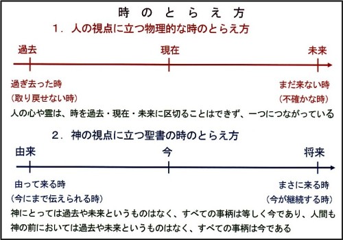 「過去を変えてこそ将来がある」 2017年12月26日 インターネットのテレビ局CGNTV(Christian Global Network Television)の番組「みことばに聞く」に当教会の牧師が出演しました。2016年5月10日放映「神への信仰と知識」 説教要約 871 古代ヘブル語の時制概念 「過去を変えてこそ将来がある」 甲斐慎一郎 イザヤ書、44章22節 ほとんどの人たちは「過去は変えられないが、未来は変えられる」と考えています。世の多くの人たちがこのように思うのは当然のことです。しかし聖書は「過去を変えてこそ、将来があり、過去を変えられなければ、将来はない」と教えています。なぜでしょうか。 一、二種類のこれからの時(未来と将来) 宗教哲学者の波多野精一氏は、二種類のこれからの時をそれぞれ「未来」および「将来」と呼び、実存哲学者ハイデガーは、「未来」および「到来」と呼んで区別しました。 ◆未来――いまだ来たらずという意味で、見通しがきかない絶望と不安の時です。 ◆将来――まさに来たらんとするという意味で、見通しがきく希望と平安の時です。 未来は現在から離れて人の手が届かない時であるのに対して、将来は今につながる人の手が届く時であり、大きな違いがあります。 説教要約 94 覚えることと忘れること 二、二種類のいままでの時(過去と由来) 前述した実存哲学者のハイデガーは、二種類のいままでの時をそれぞれ「過去」および「由来」と呼んで区別しました。 ◆過去――過ぎ去ったという意味で、今さらどうすることもできない時です。 ◆由来――由って来たるという意味で、今にまで伝えられて来た時です。 過去は現在から離れて人の手が届かない時であるのに対して、由来は今につながる人の手が届く時であり、大きな違いがあります。 三、過去―現在―未来という生き方 もし私たちが、いままでの時を過去としてしかとらえることができなければ、悪かった過去も良かった過去も、すでに過ぎ去って人の手が届かない、今さらどうすることもできないものとなるので、それを改めて現在という時に生かすことができません。その結果、これからの時を未来としてしかとらえることができず、絶望と不安に陥るのです。 神は時空を超越された方ですから、「神にとっては過去や未来というものはなく、すべての事柄は等しく現在です」(ジョン・ウェスレー)。人間も過去のことは、今さらどうすることもできず、未来のことは、来ないかもしれない不確かですから、神の前においては、過去や未来というものはなく、すべての事柄は等しく現在です。 もし私たちが現在、神を信ぜず、今まで犯してきた罪を悔い改めず、キリストの十字架による贖いを信じないで罪を赦されず、聖霊によって罪をきよめられなければ、罪深い過去の姿は、そのまま現在の姿であり、それはまた未来の姿でもあり、罪深い姿は永遠に続きます。これが永遠の滅びであり、地獄です(ヨハネ3章36節、黙示録20章15節)。 人は、罪深い過去を、罪がなかったかのようにぬぐい去ることは絶対にできません。ですから聖書は、「過去を変えられなければ、将来はない」と教えているのです。 四、由来―今―将来という生き方 もし私たちが神を心から信じて、いままで犯してきた罪を心から悔い改め、キリストの十字架による贖いを信じて罪を赦され、聖霊によって罪をきよめられるなら、その罪をきよめられたいままでの姿は、今の姿でもあり、それはまた将来の姿でもあり、罪をきよめられた姿は永遠に続きます。これが永遠のいのちであり、天の御国です(ヨハネ3章16節、黙示録21章3、4節)。 人は、罪深い過去を、罪がなかったかのようにぬぐい去ることは絶対にできません。しかし神には、それができるのです。 「わたし、このわたしは、わたし自身のために、あなたのそむきの罪をぬぐい去り、もうあなたの罪を思い出さない」(イザヤ43章25節)。「わたしは、あなたのそむきの罪を雲のように、あなたの罪をかすみのようにぬぐい去った。わたしに帰れ。わたしは、あなたを贖ったからだ」(同44章22節)。 神は、キリストの十字架による贖いによって、私たちの罪をぬぐい去ることができるので、私たちは、「栄光から栄光へと、主と同じかたちに姿を変えられて行」くという将来があるのです(第二コ リント3章18節)。
