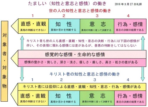 「神への信仰と感情2」 インターネットのテレビ局CGNTV(Christian Global Network Television)の番組「みことばに聞く」に当教会の牧師が出演しま した。以下のURLをクリックすると見ることができます。2014年11月21日放映「神を求めなさい」 「神への信仰と感情2」 甲斐慎一郎 第二コリント2章1~4節 一、感情には四種類がある(シェーラー) 1.感覚的な感情――肉体的な刺激によって起こる快感や苦痛の感情です。これは刺激がなくなると感情も消えてしまいます。 2.生命的な感情――からだの内部から湧き起こってくる充実感や倦怠感また緊張感などの感情です。 3.情緒(情動)――一般に喜怒哀楽と呼ばれている感情です。これは激しい感情なので、断続的です。 4.情操――情緒よりもいっそう高等で、音楽、絵画、芸術などで感じる感情です。これは穏やかな感情なので、持続的です。 感覚的な感情や生命的な感情は、「からだの感知器」として、からだを健康に保つ働きをしています。 情緒は、説明を抜きにして感じで分かるという「直感」の働きをし、情操は、推理によらず直接知るという「直観」の働きをしています。 二、感情には四つの目的がある 1.真の人間らしさを与えるためである 感情は、ことばでは表現することのできない微妙な表情をつくり、人に豊かさや深さ、またうるおいやこまやかさを与えるものです。もしこれがなければ、機械に過ぎず、木石のような人間になってしまうでしょう。 2.人の喜怒哀楽を知るためである 私たちが、人の心の喜びや楽しみ、また悲しみや怒り、そして苦しみや痛みを知ることができるのは、自分自身もこのような心を持っているからです。もしこれがなければ、血も涙もない人間になってしまうでしょう。 3.直感や直観を与えるためである 感情は、論理や思考によらない一種の知識です。論理や思考は時間がかかるので、急を要する時や突発的な出来事には間に合いません。神は、私たちに論理や思 考による知性とともに、論理や思考を抜きにして一瞬にして知ることができる感情を与えてくださいました。ただし直感や直観は推測で、不正確ですら、知性に よってそれが正しいものであるかどうかを確かめることが必要です。 4.意志の決断の正否を教えるためである 知性による観察 と判断の前に直感と直観がありますが、知性による観察と判断によって意志の決断をし、意志の決断の結果が行為であり、その行為には感情が伴います。すなわ ち良いことを語り、良いことをするなら、喜びと平安な感情があり、悪いことを語り、悪いことをするなら、悲しみや苦しみの感情があります。感情は、意志の 決断が正しかったかどうかを私たちに教えるものです。 キリスト者も世の人も直感・直観・知性・意志の決断・行為には感情が伴い、その表情に現れる感情は、その人の個性なので、善悪の判断をしてはならないのです。 三、感覚は脳で知識に変換される 感情が物をとらえるための道具(ツール)は、五感(視覚・聴覚・嗅覚・味覚・触覚)ですから、感情で目に見えない神を知り、とらえことはできません。それ で人の脳は、五感でとらえたものをすべて信号化して脳に送り、脳は、五感でとらえた情報を知覚そして知識に変換しています。 聖書は、「信仰は聞くことから始まり、聞くことは、キリストについてのみことばによる」と教えています(ローマ10章17節)。 私たちは、まず「神のことばを聞き」(聴覚)、次に「よく考え」て(思考)(第一コリント15章2節)、それが「真理であることを知り」(知覚)、最後に その知った真理を「信仰によって、結びつけ」る(ヘブル4章2節)、すなわち「信じる」なら、「神を知る知識」になります(コロサイ1章9節)。 エバは善悪の知識の木を見た時、「食べるのに良く、目に慕わしく……いかにも好ましかった」ので(創世記3章6節)、取って食べました。彼女は、感情で判 断して罪を犯しました。人は、感情ではなく、「取って食べてはならない」(同2章17節)という神のことばに基づいた知性によって判断して、生きなければ ならないのてす(マタイ4章4節)。 甲斐慎一郎の著書→説教集