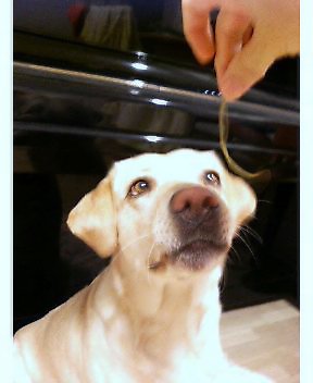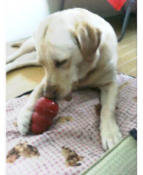 「早食い王」のクッキーが唯一時間をかけてなめてくれるクリームチーズを中にぬったコングです。「手で押さえてっと・・・くんくん、いい匂い~」「うん、美味しい」「まだ、奥にあるンだけど・・・届かない・・・」大抵、奥の方のクリームチーズが取れなくてコングをくわえて持ってきます。長い時には30分以上頑張っているときもありますよ。スプーン1杯のチーズをそのままあげたらきっと0.5秒でなくなってしまうことでしょう。その点コングはホントにありがたいアイテムです。 あラブラ♪かラブラ(クッキーがシーズンになって少々憂うつな私のウェブショップです)