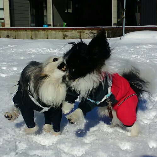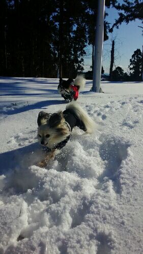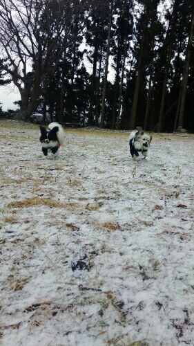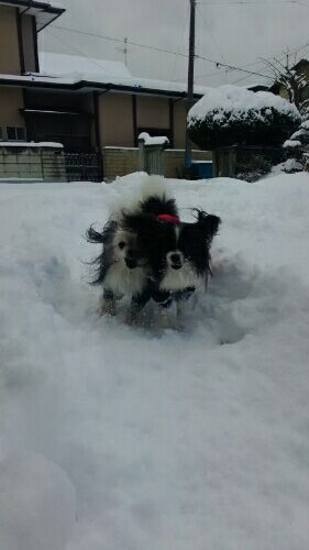 起きたらビックリ。 雪がどっさり積もってた~。 ママは除雪で疲れたから 今日は空き地で走って!! こんなに積もってた雪、 駐車場三台分キレイにしましたから。 まあ、楽しく遊んだからいいよね! こんな雪玉がつく日には 遠くへ行ったら凍えちゃうしね。 わんこたち、 あったかいところに移住したいねぇ!!