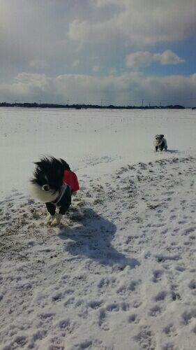 車を停めて海岸へ向かいます。 結構、雪が積もってて、 埋まりながらも 進みます。 少し歩いて やっと雪がなくなったね。 風で飛ばされるから、 海岸は歩きやすいね! 誰もいない、 カラスすらいない、 わんこたちと私だけ。 貸切でした。 寒くて、ほぼ走りっぱなしの わんこたちでした。