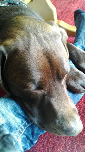 遊びにきた 茶ラブのタフィーさん。 足枕でオネンネです。 微妙に不味いペペロンチーノの 日替わりランチにがっかりした後、 いただいたカフェラテは 美味しかったけれど。 残念なランチの後に わんこに癒やされたのでした~。