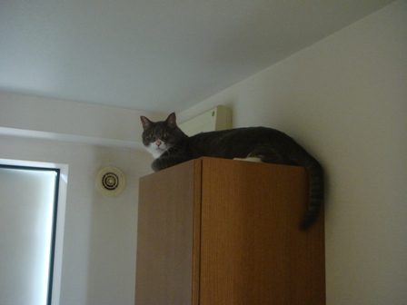昨日の雷雨で今日は涼しく過ごしやすいです。Wa~くんも、暑い日はゴロゴロ寝てばかりだけど、すこし涼しくなると、とたんに遊んでくれ~と催促してきます。定番の“だるまさん転んだ”や、“モップでGO!”で遊び疲れて一休み。(って疲れてるのは私ですが・・・^^;)背の高いシューズボックスの上に乗っかって、誰にも邪魔されないひと時を楽しんでいます。身体が大きくなってしまって、こういう高いところにジャンプできないのでは。。。。と心配していましたが、まったく心配ないようです。よかった・・・猫ってやっぱり高いところとか狭い場所とか好きですねセラピスト活動を主に書いているブログです「愛しい日々」