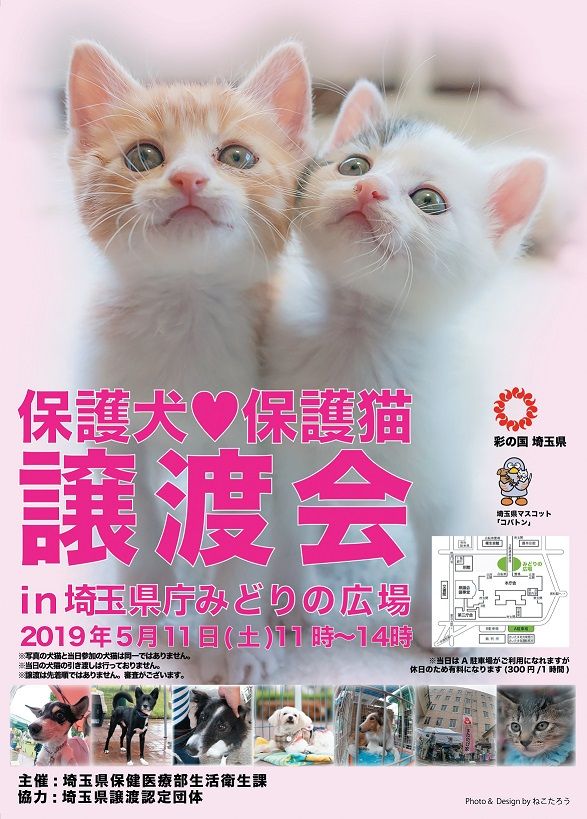 2019年5月11日(土)には、埼玉県庁でもまた「保護犬・猫譲渡会」が開催されます。