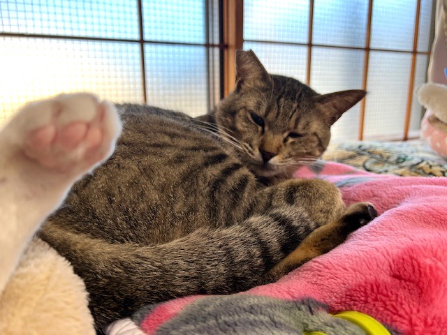 お腹ナデナデ待ちのごろんと転がった格好を見ると、撫でずにいられません(笑)