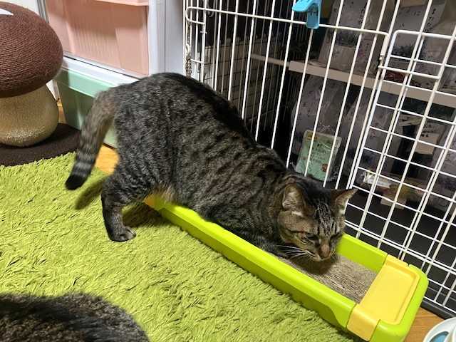 「マンボ」に甘えるように爪とぎにスリスリする「フク」