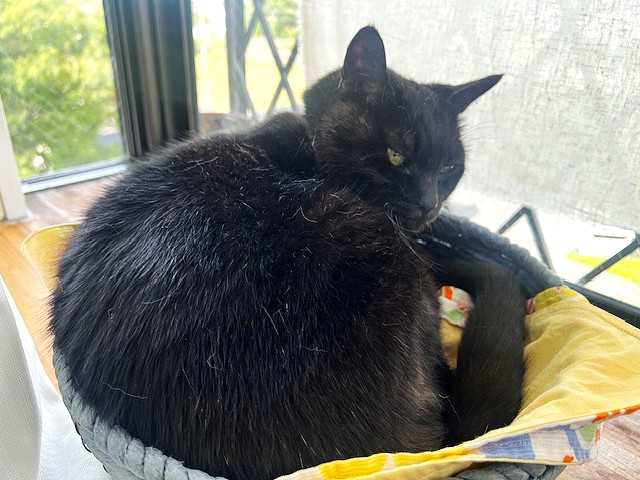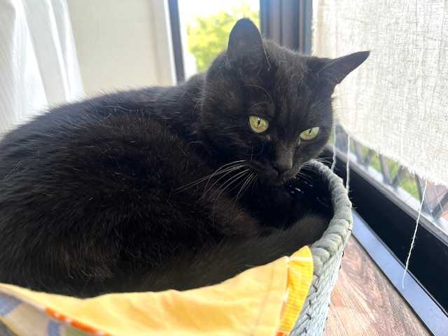 キキが珍しく出窓のお風呂(爪とぎ)じゃなくて、小さい籠の中にいました。