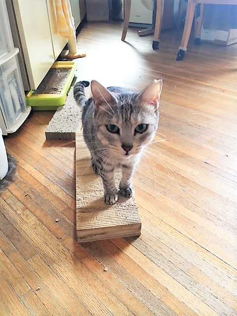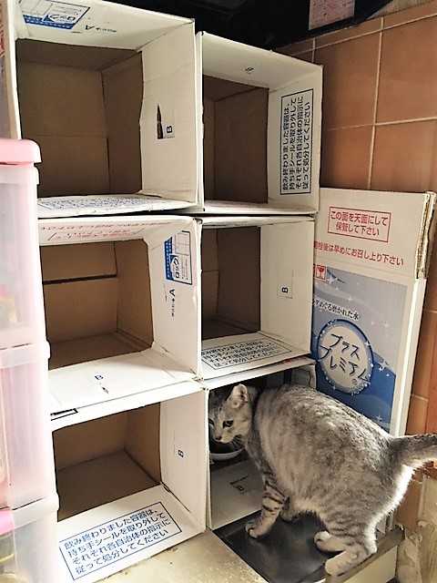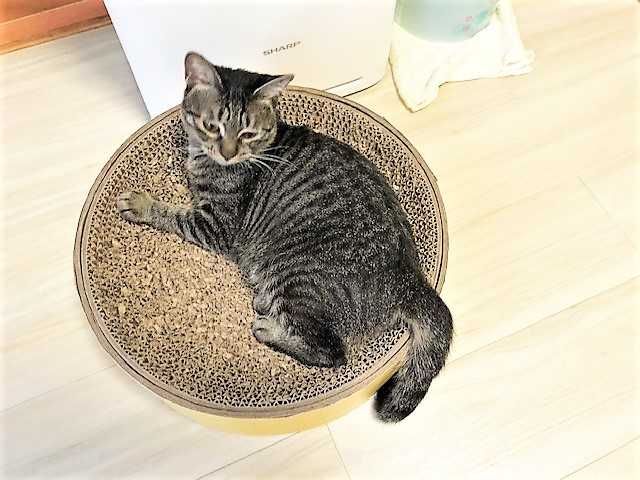 今は同じ場所に置いてあるマンションは木製になりましたが、以前は段ボールだったので中で爪とぎもしていました。それも楽しそうだったな。