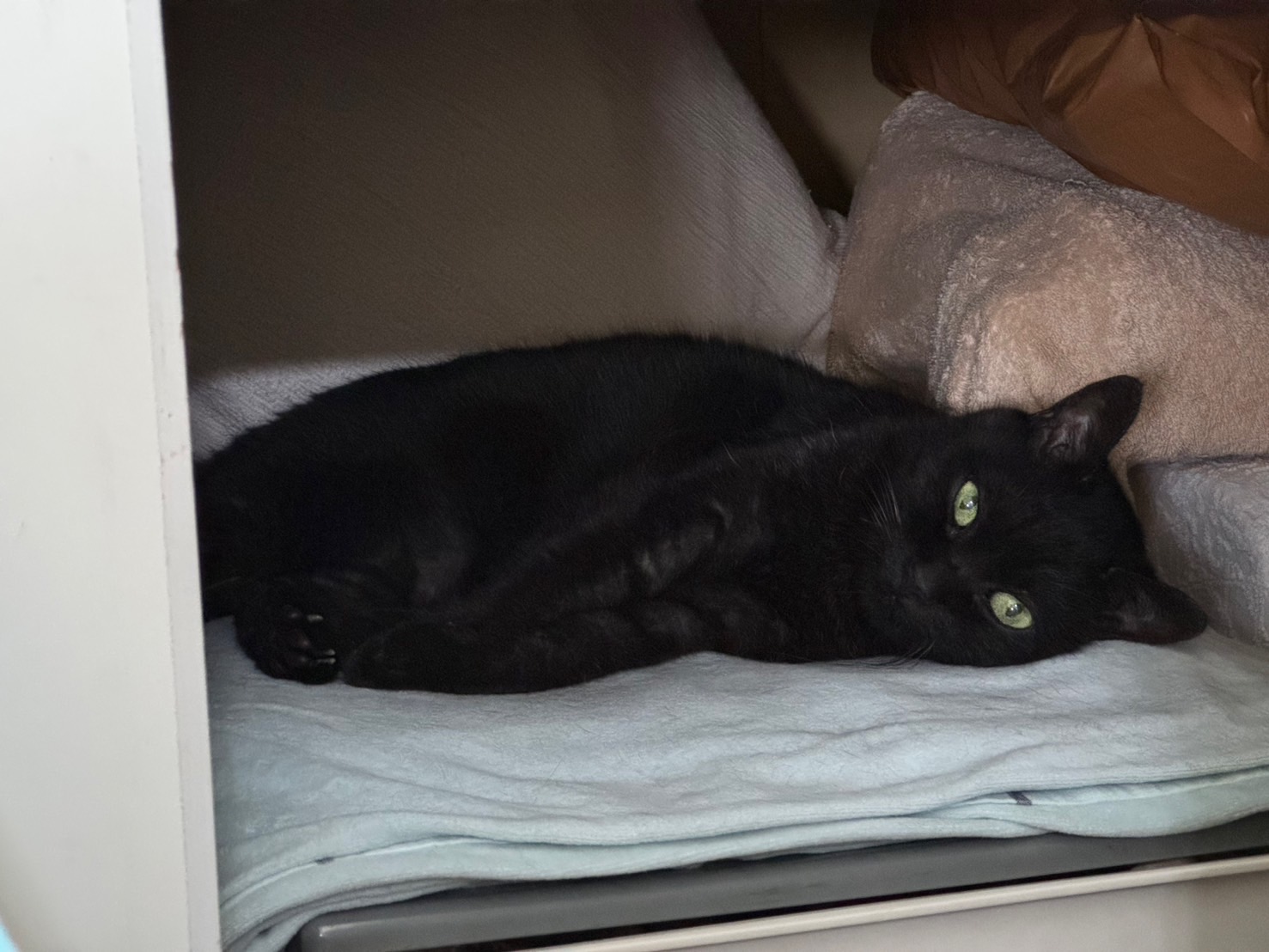 押入れの下の段に寝ていました。珍しいな、ここにいるのは。
