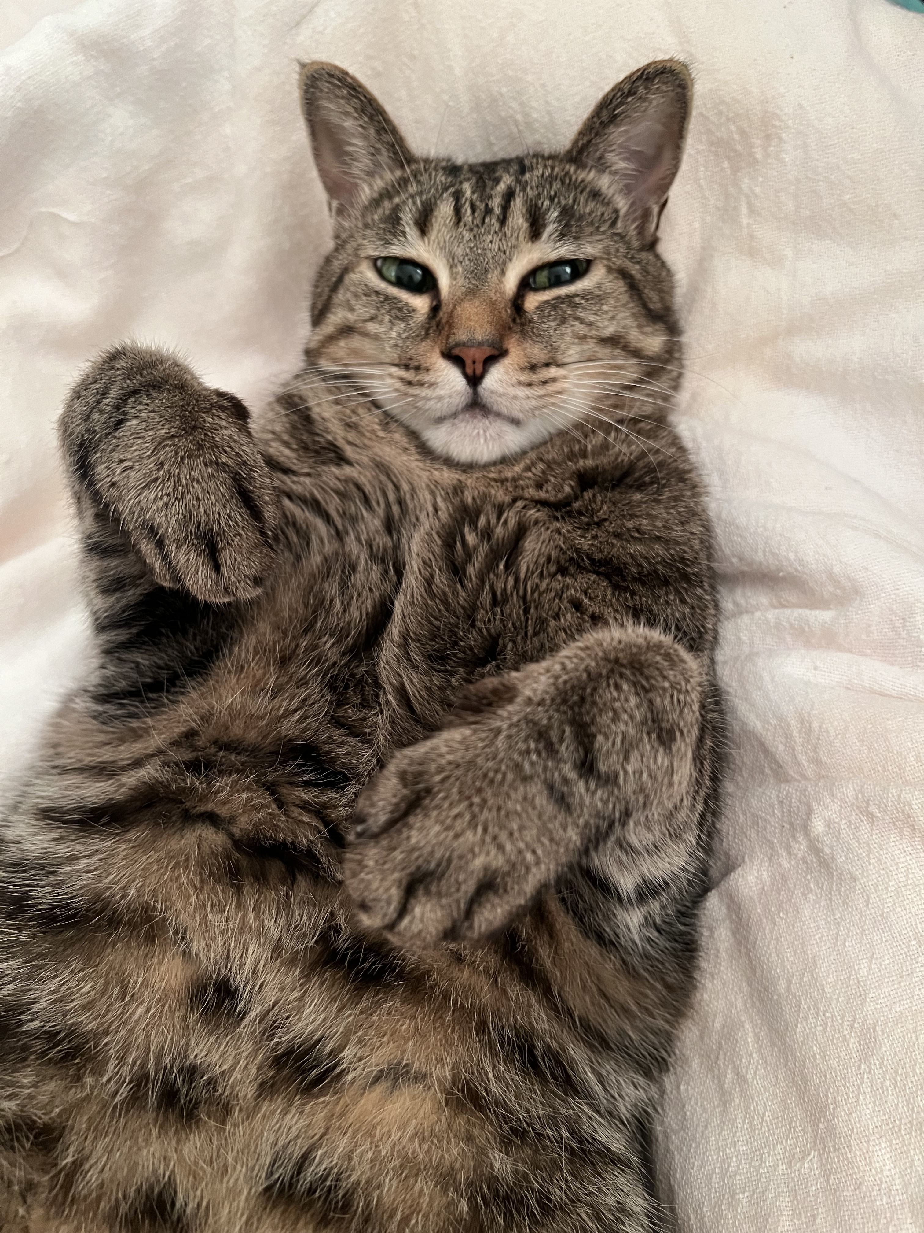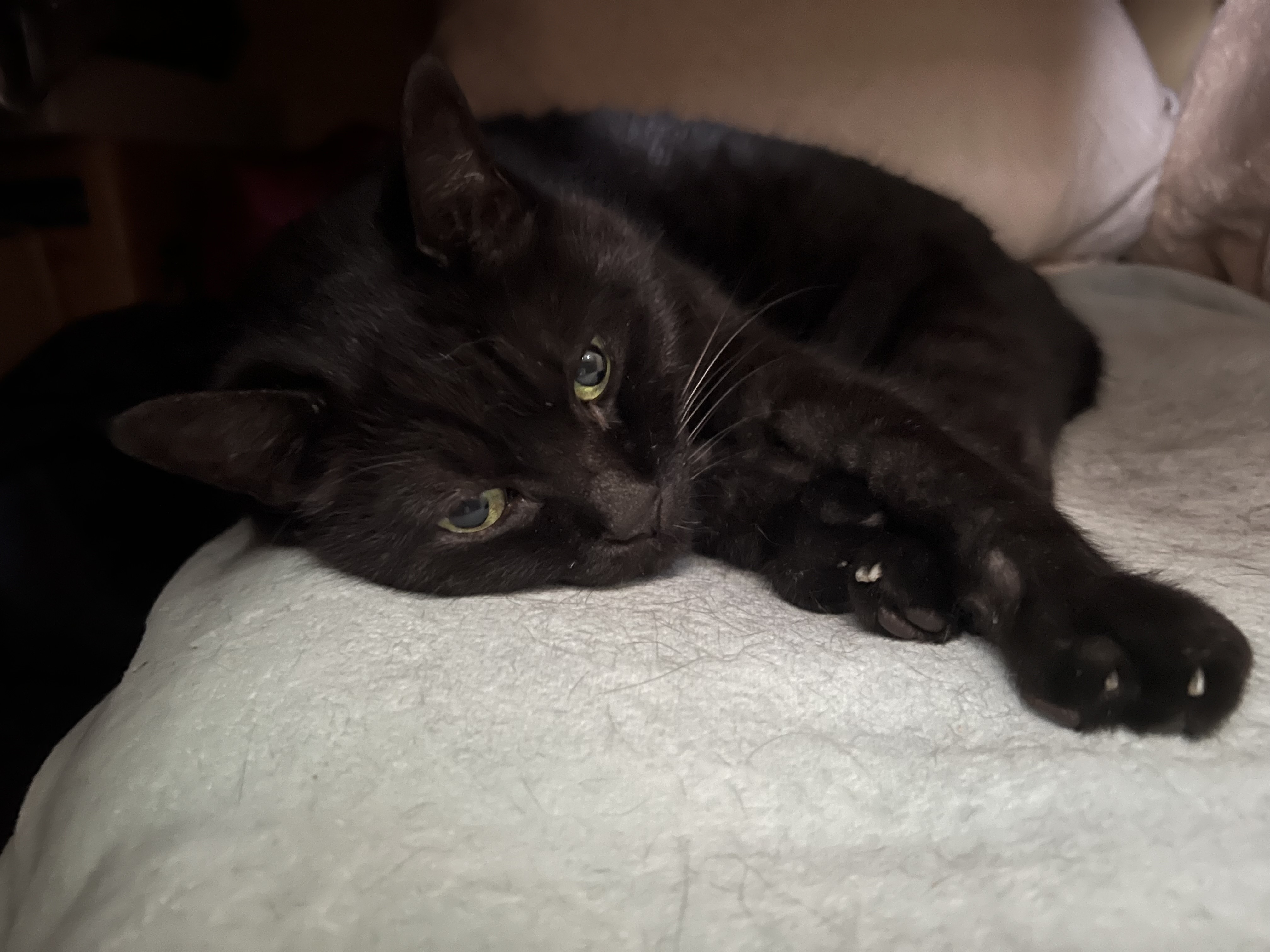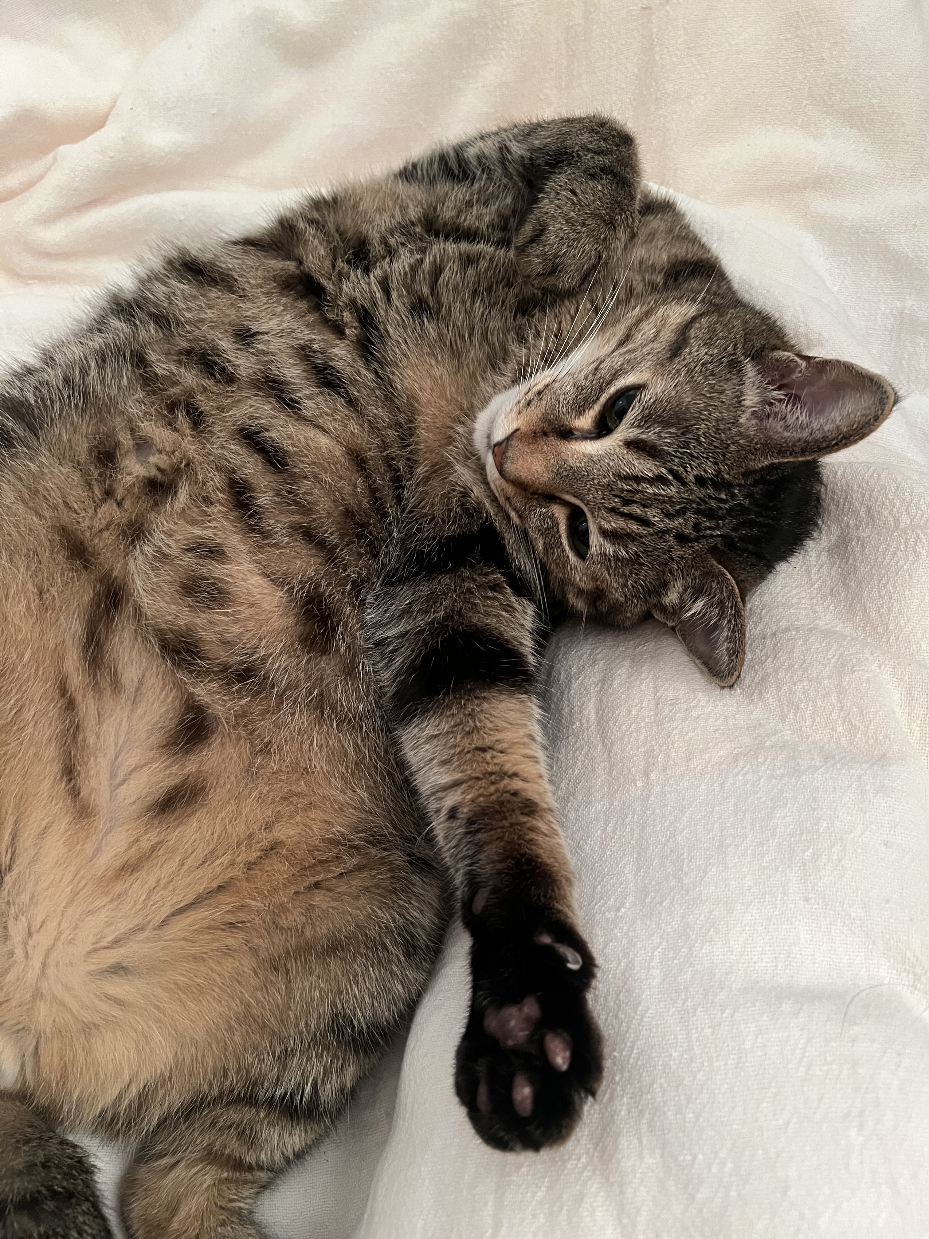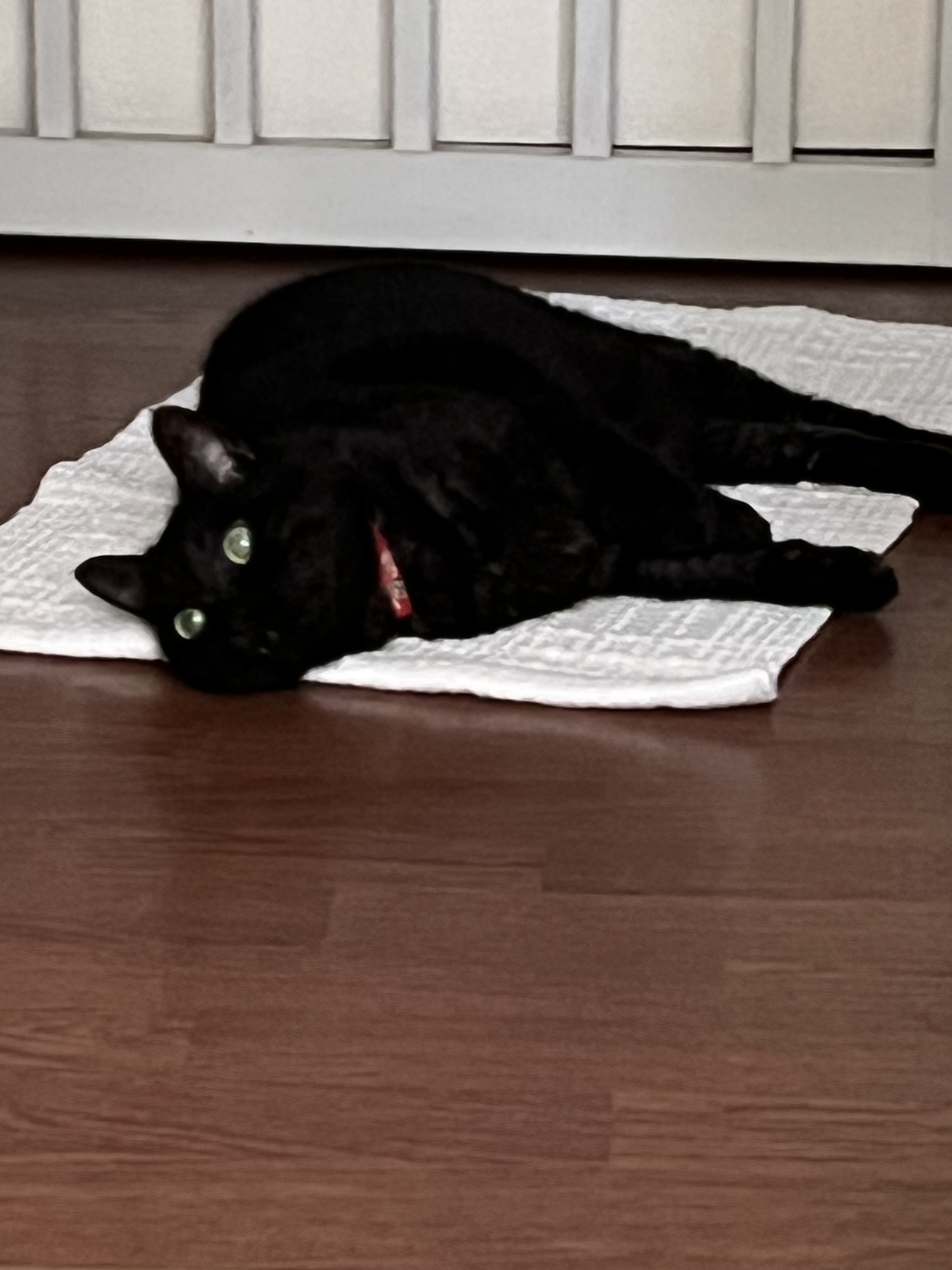 私の部屋のドアはいつも開けっぱなしで、猫たちが行き来できるようにしてあるので、ここでキキが寝ていると、私も横になったままキキのことを見らるのです。