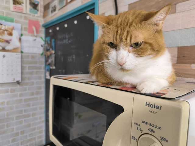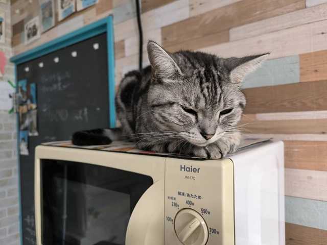 マーちゃんはレンジの上がお気に入り?ここは突然のようにご縁が決まる場所なんよ。