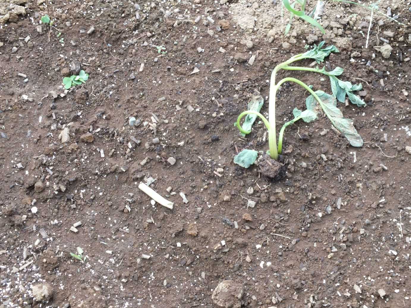 写真右手が種芋植えたところです。左側にある小さな芽二つが、昨日芽かき後、枯れずに残っているものです。