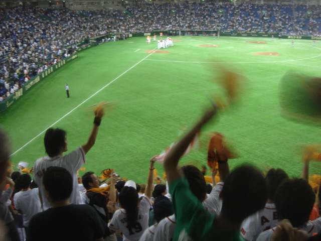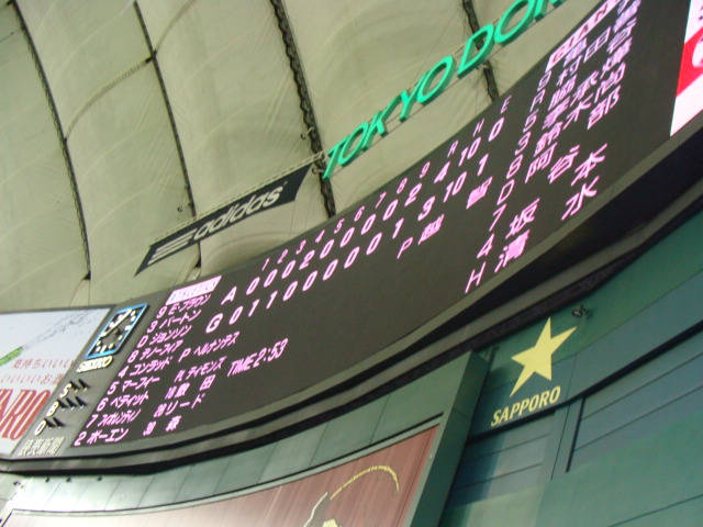 3月23日のアスレチック戦そして昨日のレッドソックス戦見てきた。結果2連敗で、オープン戦は2勝しか出来なかった。オープン戦は結果より内容だと思うが、それにしても少し不安・・・ はないない!!アスレチックス戦も逆転負け・・岡島は、7回頭からの登板で、全球 投げた時全球にフラッシュの嵐!!!!!メジャーリーガーはさすがだと思う。DH制で行なわれたが、1~9番まで1人も気が抜けないような打線だった。(両軍ともに)そして少しでもあたりがいいとホームラン。まぁ ドームが狭いんだけど。。。。。対するジャイアンツはいまひとつ打線に元気が無い感じだ。坂本を除いて。 それからGファンにはショックというか残念なニュース!!! 清水と由伸の応援歌の歌詞が変更(由伸は半分が)で曲はそのまま。 そして、二岡と阿部の応援歌は曲も歌詞も変更してます。 何故かというと、いろいろ著作権の問題らしい。 詳しいことは応援団のブログで。。。 で、その二岡と阿部の応援歌はどうしてもなじめない・・・・・ 前のが良かっただけに、今回の曲も歌詞もいまひとつで、印象に残らない。。。とにかく26日のレッドソックスVSアスレチックス戦も見に行くが、なんといっても、4月1日のドーム開幕戦!!!ドラゴンズ!! かかってきやがれぇー!* ラミレスの応援歌 光り輝く明日(あす)を見せる その広い背中! オォラミレス! オォラミレス! おぉ誇り高く!