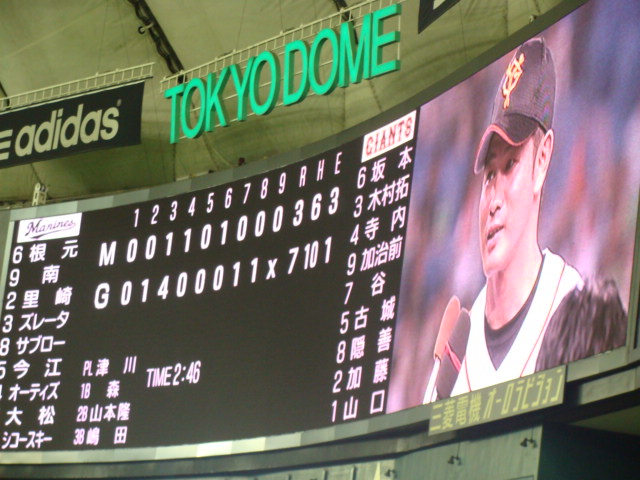 今日は、谷 佳知デー!!「ホームランを打つよりも、繋ぐ、塁を進めるのが役目。今日は2ベースヒット打ちます!」 と佳知。今日はツーベースではなく8回に2ラン!!でした!!7回まで緊迫した投手戦!僕は5月3日の神宮での内海と村中の投げあいを思い出した。8回まで村中にノーヒットに抑えられて9回に一挙5点入れて勝利した試合。今日も8回か9回に、先制するかと思っていたら、ピッチャーは許に変わり、木村のヒットを足がかりに一挙4点!そしてクルーンが、9回最後のバッター ボカチカをショートゴロでうちとりゲームセット!そして僕らが水道橋駅に向ってる途中で、なんと西武のボカチカ選手が、家族といるところに遭遇! そして握手してもらった。グローブのような厚い手だった。家族と一緒だったので後ろから撮った写真。わからないよね 真ん中の水色のシャツ着てる人がそうです。子供を抱いているので、ピンクのズボンをはいた足が左右に見えるでも、なんで電車で帰るの??その後ボカチカ選手も、水道橋駅へ向いました。明日も打たないでね。。。。さぁ 明日は、グライシンガーかな?前回のリベンジだよ! グラちゃん!