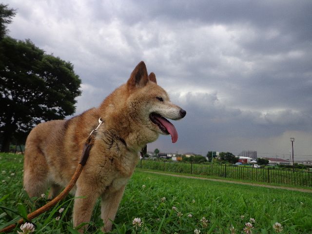 こんにちは。柴犬さくらです。近所の出羽公園で夕方散歩です。だんだん曇り空になってきましたね。今日の夕方は、埼玉県戸田市の花火大会が開催される予定ですが、雨が降らなければ良いですね。そうそう、公園内の花壇に沢山のひまわりが植えてありますが、今日から無料で花摘みができます。花摘みですからね、先程は、スコップで根こそぎ持ち帰ろうとしている方もおりましたが、花摘みですからね。夏の花を楽しんでもらえればと思います。それから、戸田の花火大会は、JCOMケーブルテレビで午後7時から中継をしてくれますよ。にほんブログ村