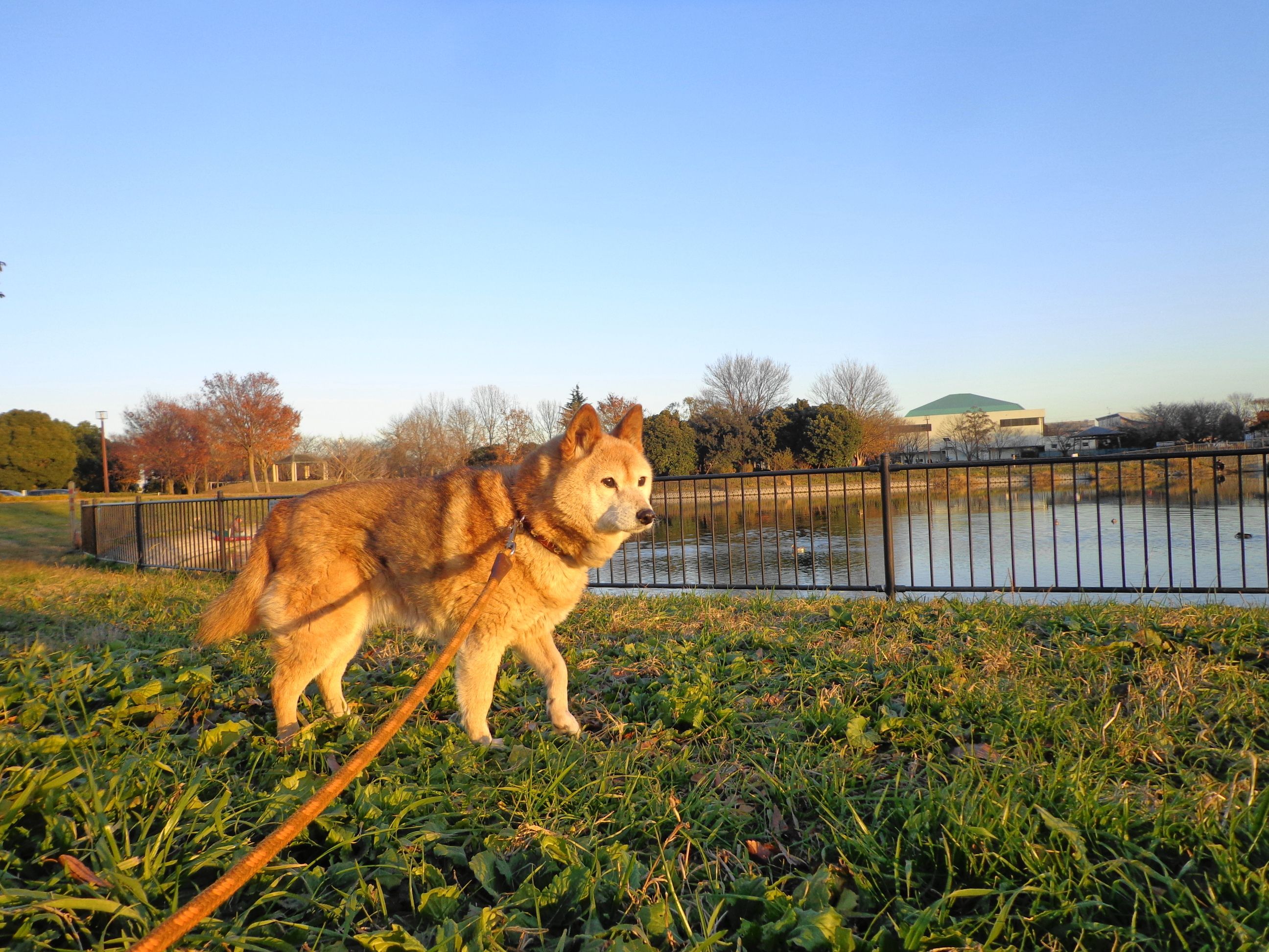 こんばんは。柴犬さくらです。今日は。近所の出羽公園へお散歩です。夕日を浴びて金色色に染まってます。池には、ヒドリガモが遊んでいます。こちら側は、風がないので鏡のようですね。♪白柴さんとご挨拶、また明日。♪山茶花も輝いていましたよ。