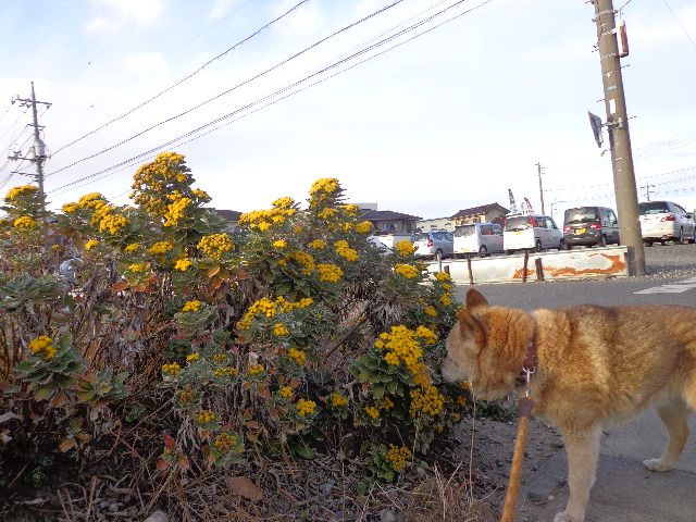 こんばんは。柴犬さくらです。今日の夕方散歩、道端に咲いていた黄色い花が満開です。何という名前の花なんでしょう。イソギクという名前が判りました。 千葉から静岡の海岸線、伊豆諸島などに分布する野菊の一種です。磯に自生するのでこの名前があります。庭や花壇が寂しくなりがちな秋から冬に明るい色彩の花を咲かせるからか、園芸でもよく栽培されています。 毎年花を咲かせる多年草で、細い地下茎を四方に伸ばして生長していきます。茎は斜め上に伸び、葉っぱが密につきます。葉っぱは長さ5cm程度でしっかりとした厚みがあります。日本海側は大雪の影響もあり、関東も夕方以降とっても冷たい風が吹いてきました。皆様も風邪などひかれませんように。一部インフルエンザの方がちらほら流行の兆しかも知れません。
