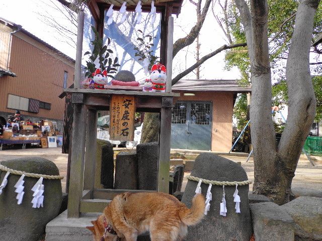 境内には、安産の石が安置されていましたよ。犬の置物の真ん中にある丸い石をなでると安産になると信じられています。