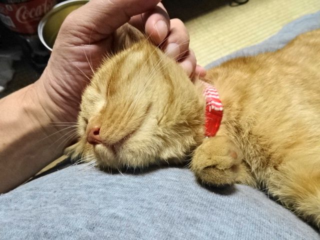 「にゃん」に首輪を付けました。人に慣れさせ、今度は首輪に慣れさせます。もし、飼い主の方がいれば首輪に何らかのメッセージがあると思うのです。