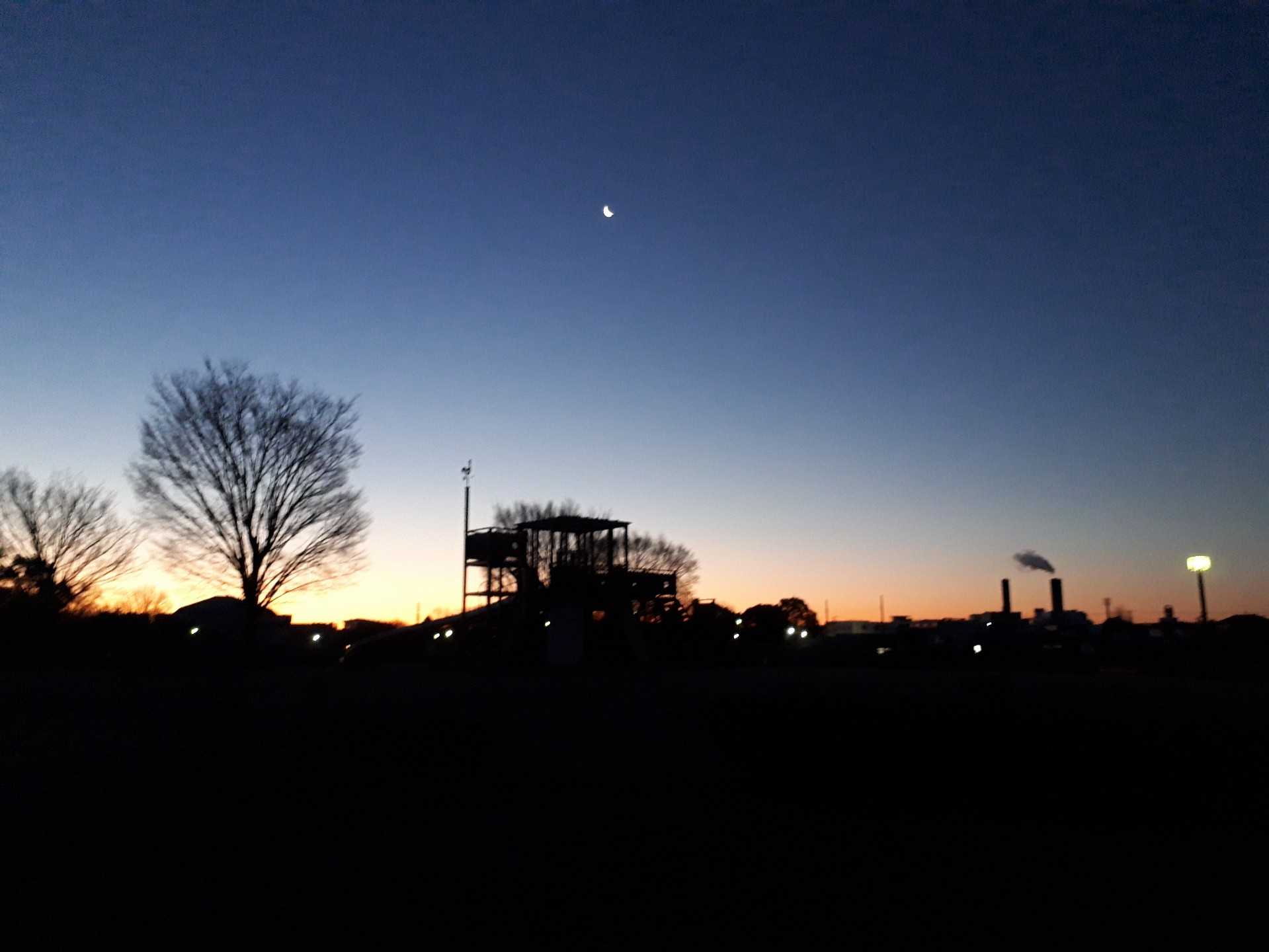 ままもなく朝日が上る時間です。右側の煙突は、綾瀬川沿いにある川口市の清掃局の建物です。上空にはお月さまが輝いています。さあ、今日も一日頑張ろう!