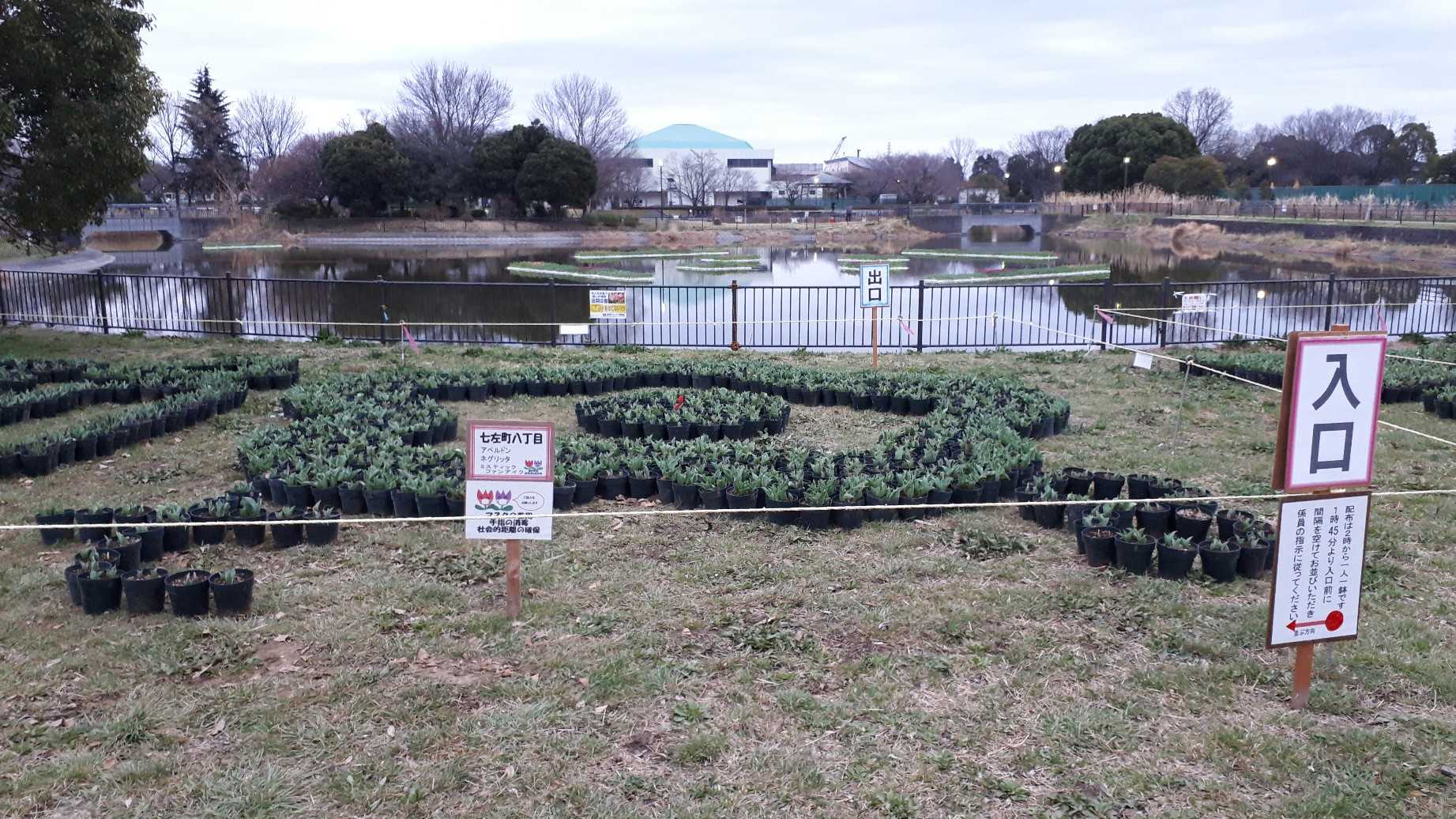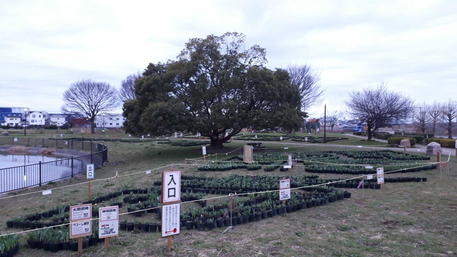 私達は、ここです。池にも水耕栽培のチューリップが浮かべています。今年は、寒かったので、チューリップの花がまだ咲いていませんが、開催は来週の日曜日27日ですので、それまでグングン花芽が伸びてくれると良いですね。