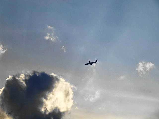 空を見上げると、飛行機が、羽田方向に向かってます。