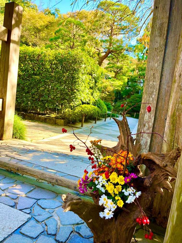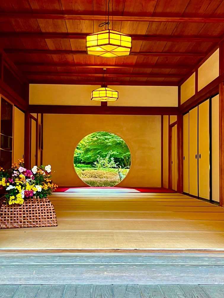 丸窓の奥の紅葉が段々と色付くようです。秋の季節花、菊の花がいけてありました。日に日に風景が変化して行くのも良いですね。