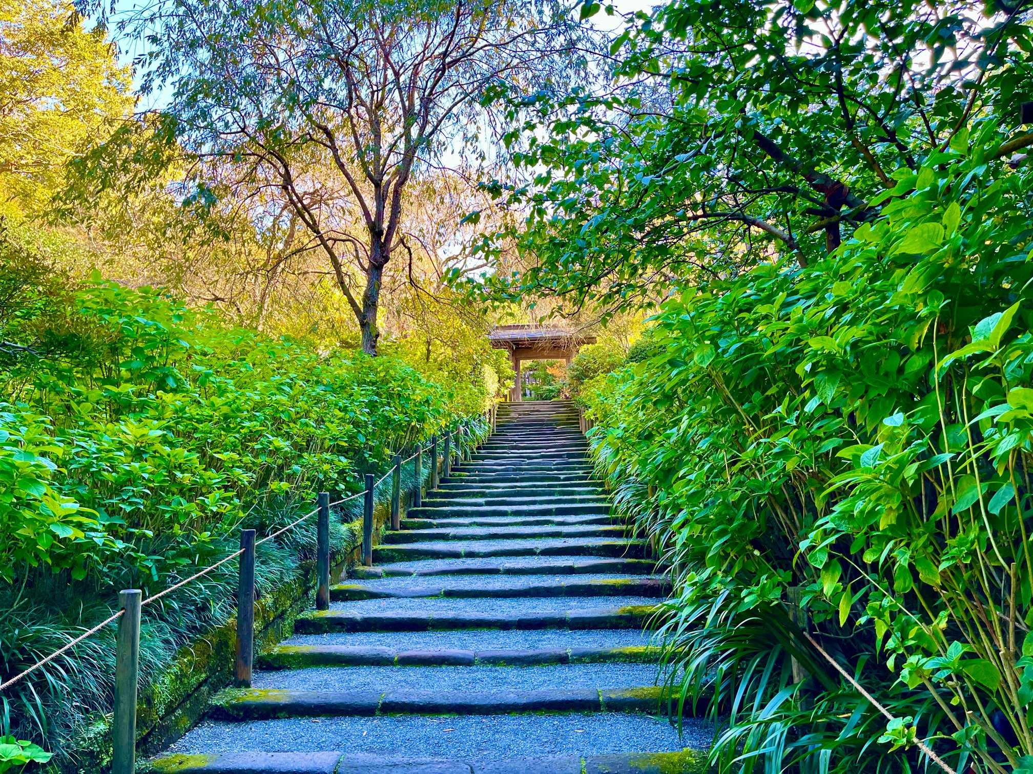入り口から、石段を登って行きます。両側は、アジサイです。アジサイ寺でもとっても有名ですね。