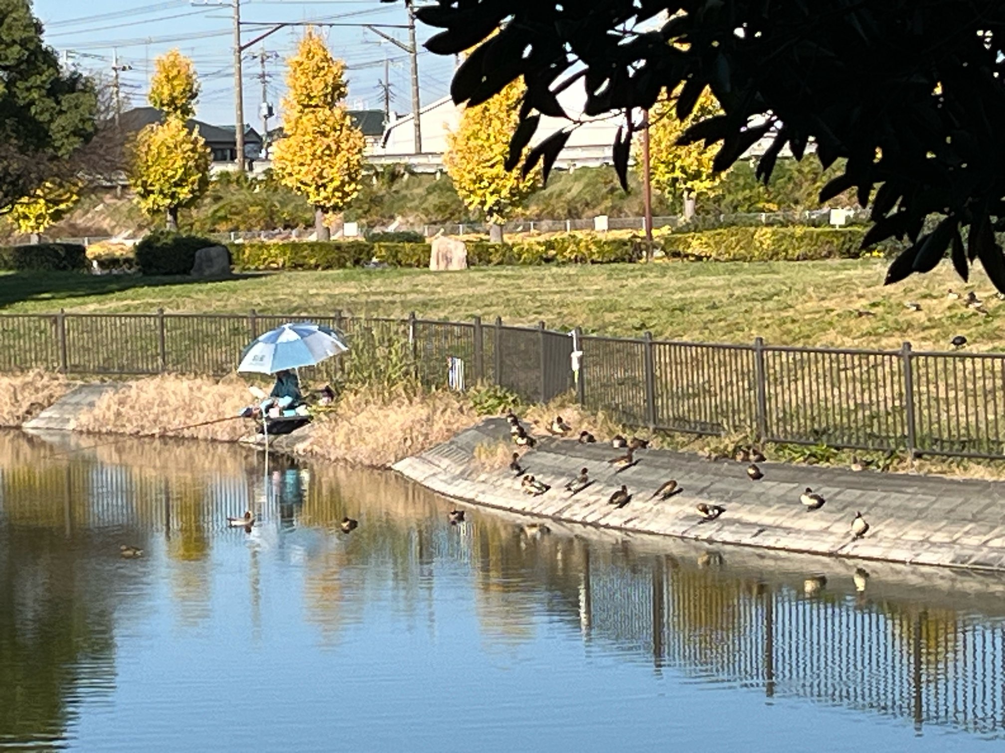 釣り人の隣に、日向ぼっこの鴨さん達です。長閑な風景ですね。