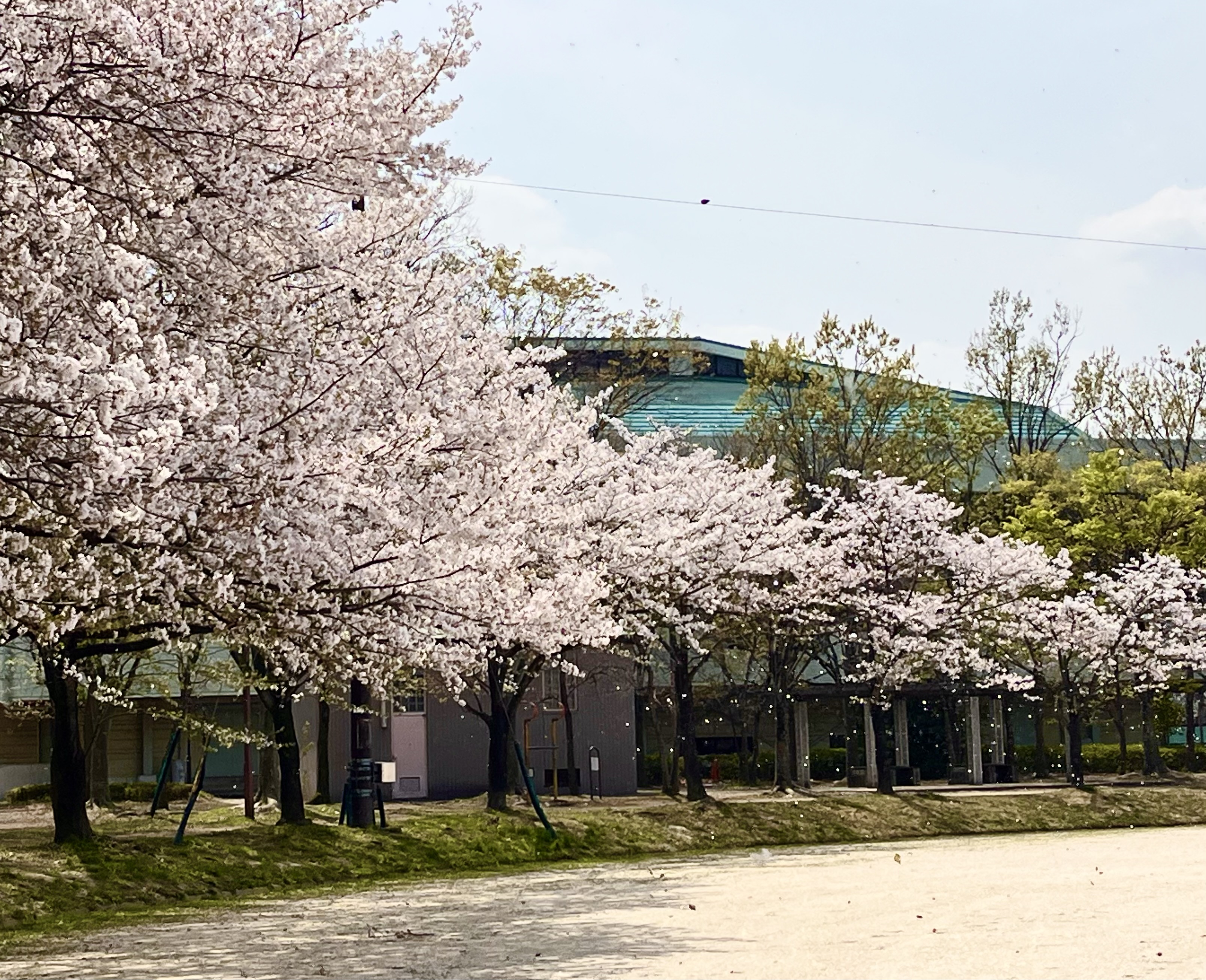 平日のグランドで誰もおりません。花吹雪のグランドになってます。