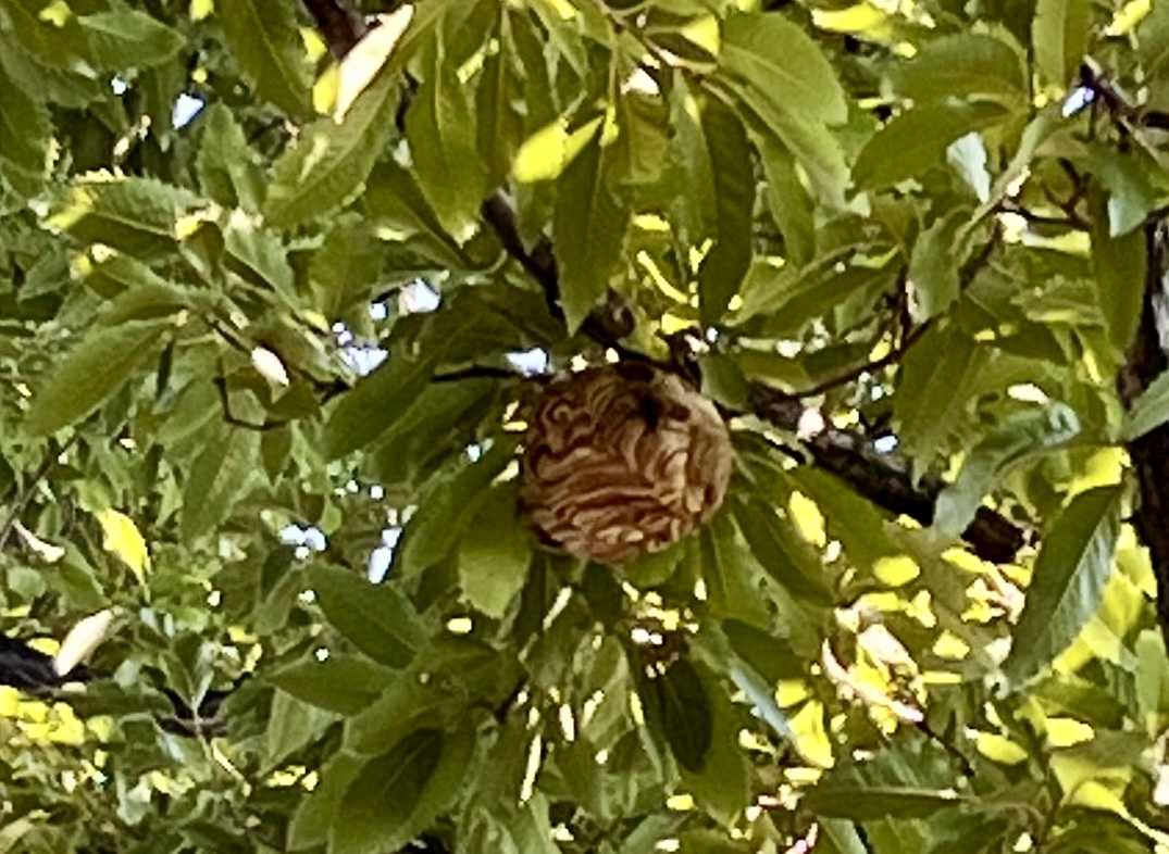 真ん中の木の左側の枝にスズメバチの巣があります。これから爆発的に巣が増殖しますので早めの対策が必要です。