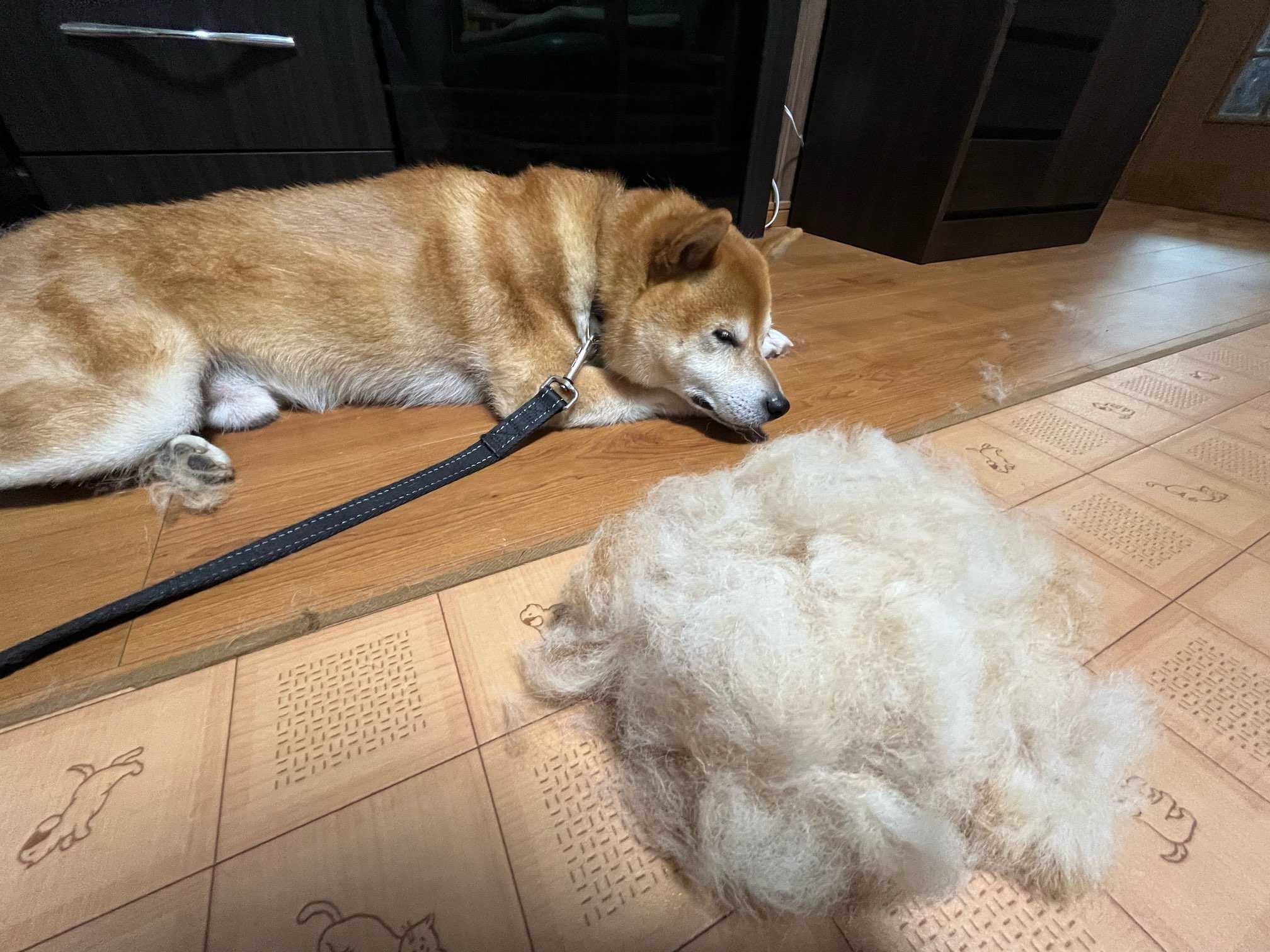 これはカイくんの脱皮の様なもんです。換毛で少しブラッシングしたらこれだけ抜けました。夏本番ですからね。