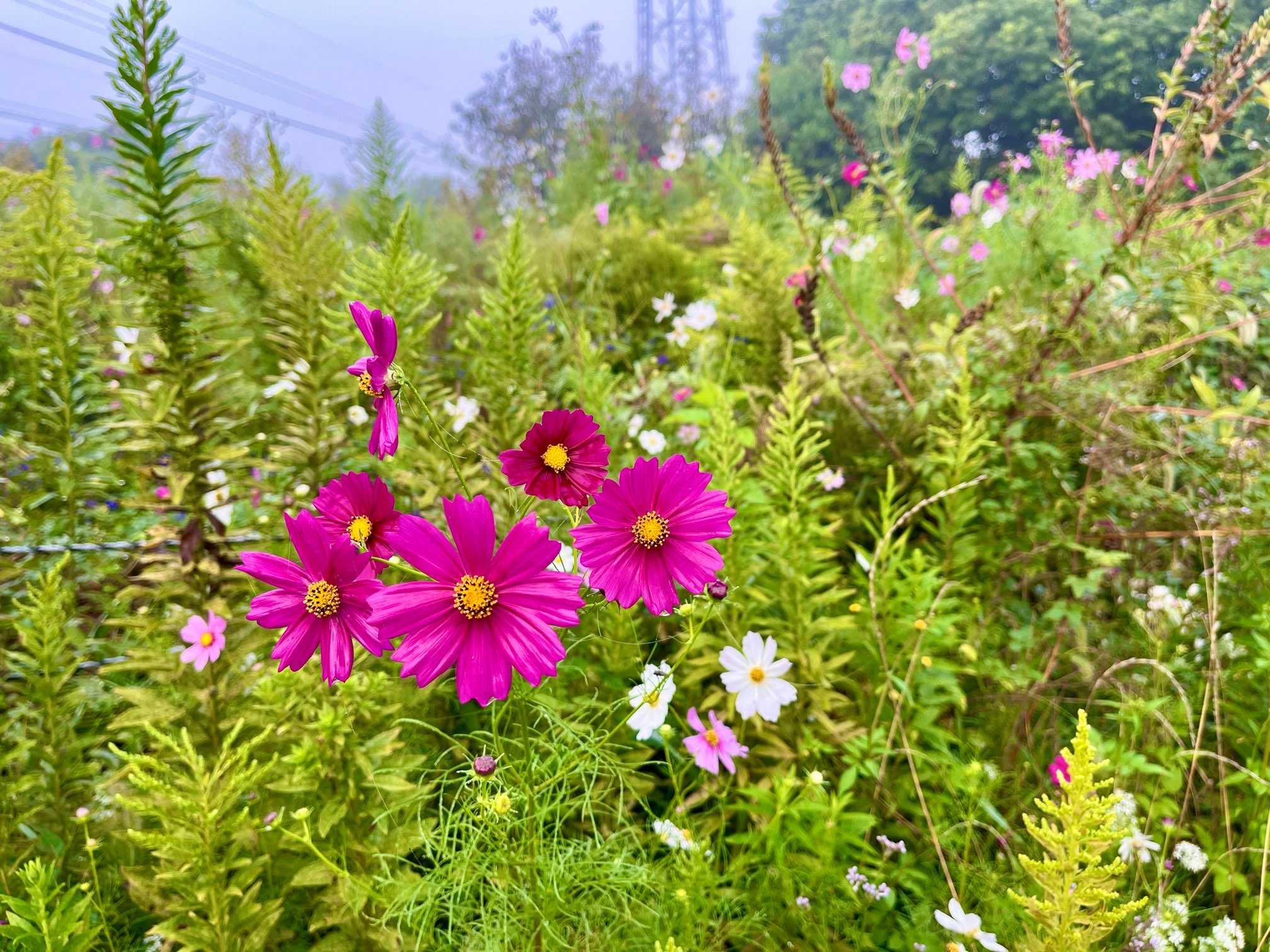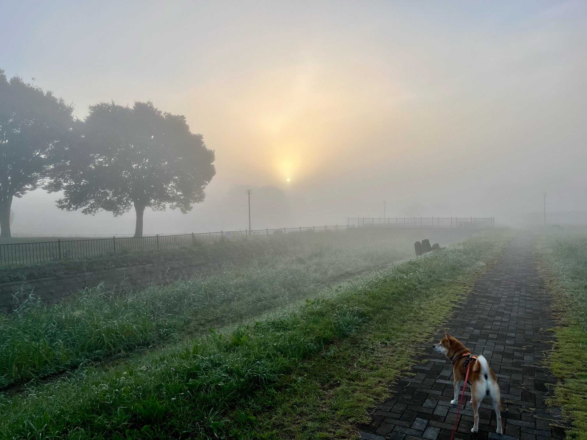 今朝の朝散歩、朝靄で真っ白ですぅ。