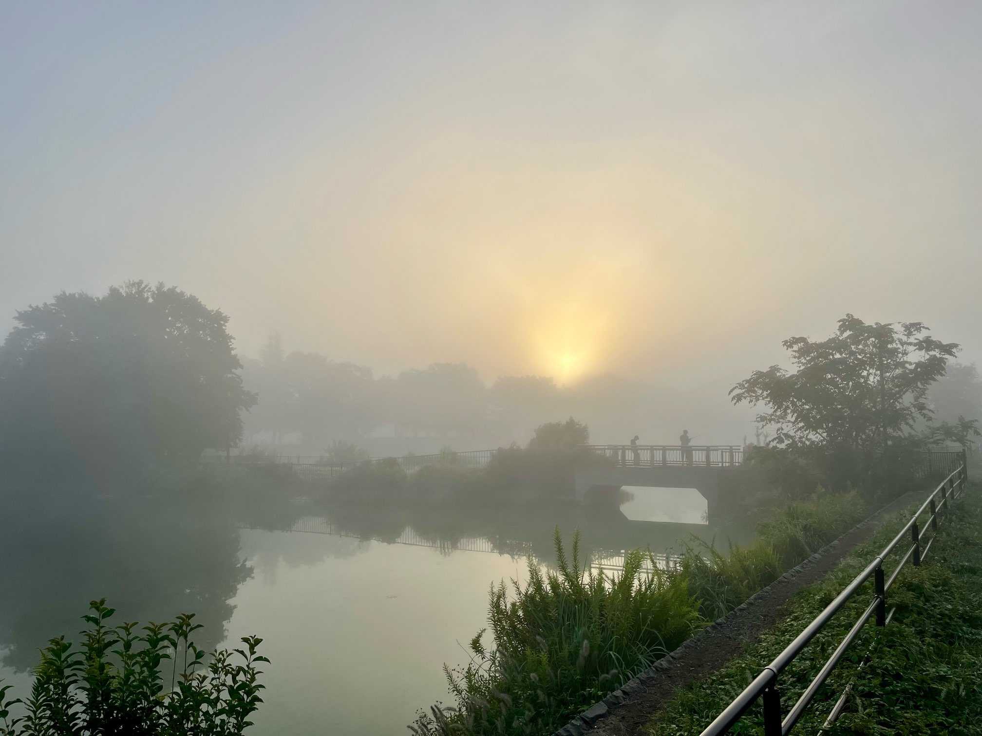 次第に朝日が昇り、霧が薄くなってきました。