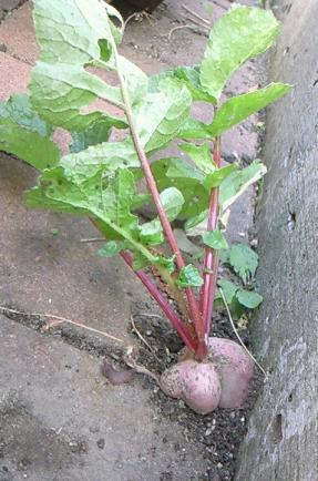 今年も、細々と家庭菜園をやっておりましたが収穫時期をとっくに終えて、庭のプランター野菜たちはすっかり枯れ気味・・・・そして、庭は荒れ放題・・・そんな時、息子が「チューリップの球根」をもらってきました^^早く植えてみたいと大騒ぎなので重い腰を上げて野菜プランターの撤去とチューリップの植え替えをする事にしました!!最初のプランターを片付けているときこんな物を発見してしまいました~こ、これは・・・もしや!!「二十日大根」の、ど根性君??たぶん種がこぼれて生えてきたんでしょう残念ではありますが、庭の掃除とともに回収しちゃいました--レンガの間からだったので、スポッとは抜けずお尻が残っちゃいました><あんな所で、よくここまで成長したね~