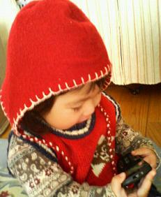 フリースを使って、娘に帽子を作ってみました~しかし、帽子嫌いの娘はお気に召さないようで・・・Σ(゚口゚; すぐにポイっ~ ( ̄‥ ̄)=3 フン写真は携帯に気をとられているだけで・・・仕方がないので最近お気に入りの「ぽぽちゃん」に同じ帽子を作ったら、娘が帽子好きならないかと・・・・うちの「ぽぽちゃん」半袖、スカートでこの季節には寒そうな格好・・・そこでamagaeru生まれて始めて人形の洋服に挑戦してみました~娘に「モンキーパンツ」は作った事があるものの洋服作りなんて中学校のパジャマ製作以来!! (>▽<;; アセアセ作り方なんて覚えている訳もなく・・・なんとか自己流で、完成しましたが^^ コートは襟をつけるテクがなく「割烹着」に見えます。(* ̄ω ̄)ノそれでも「ぽぽちゃん」に冬服が出来たのでこれで外に持ち出しても寒そうじゃないね!!なんですが・・・娘の反応は・・・そんなに興味なし。o( _ _ )o...おそろいの帽子も関係なく・・・代わりに息子が着せ替えごっこしてるし・・・(>▽<;; アセアセあぁ~おそろいの帽子作戦は失敗だったか><それでも「ぽぽちゃん」の洋服の作り方が分かって洋服作りにハマりそうなamagaeruです (*>艸