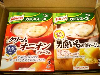 久々に「モラタメ」さんからお届け物がありました~寒い時期は、よく活躍するカップスープ!!「クリームオニオンポタージュ」と「男爵いものポタージュ」です~今年はお盆過ぎから、寒い日が続き・・・・しばしば飲んでは、ホット一息ついていました^^お湯を少し少なめにいれて、濃い目に飲むのが大好きです(*′∇`*)早速「オニオンポタージュ」を試してみました^^玉ねぎの風味が加わって、味に深みがあって美味しいです!!たまにスープセットを購入する時があるんですが、「オニオンスープ」ってなぜか残っちゃうんですよね・・・・そんな時は、「ポタージュ」と「オニオンスープ」2袋をまぜまぜして飲んでみるのもいいかも~( ̄▽ ̄) ニヤ