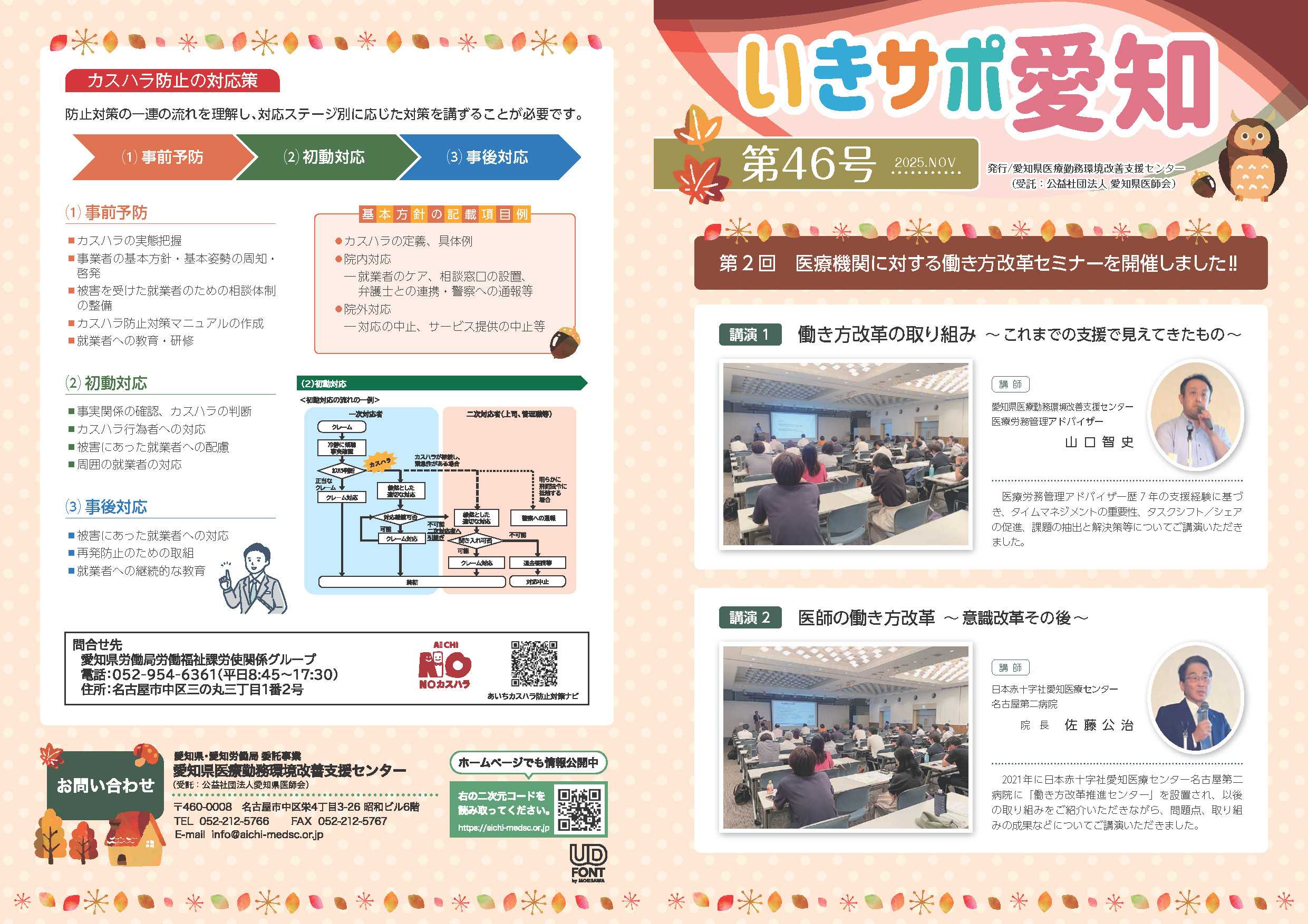 愛知県医療勤務環境改善支援センターでは、医療機関の「働き方改革」や「勤務環境改善」を支援する取り組みを進めています。今回は、その活動を紹介する『いきサポ愛知 第46号』が新たに公開されました。■ 今回の特集:医療機関向け働き方改革セミナー現場で実際にどのような改善が行われ、どのような課題が見えてきているのか。医療スタッフの皆さま、患者様、そして医療機関の経営者にとっても、参考となる内容が満載です。講演のポイント(一部)● 医療スタッフの業務負担を“見える化”し、改善につなげる方法● タスクシフト・タスクシェアによるチーム医療の強化● 医師の働き方改革の現状と今後● カスタマーハラスメント(カスハラ)対策の最新情報● 現場の声を踏まえた「働きやすさ」と「医療の質」の両立医療現場を支える方にとって、「明日から使えるヒント」が詰まっています。■ 医療勤務環境改善は、すべての人にメリットがあります医療機関の働き方が変われば、提供される医療の質も上がります。● 医療スタッフの皆さまへ働きやすい環境は、心身の健康やキャリア形成につながり、「安心して働き続けられる医療現場」につながります。● 患者様へスタッフが良い環境で働けることは、安全で丁寧な医療サービスの提供に直結します。● 経営者・管理者の皆さまへ業務改善や離職防止は、医療機関の安定運営に大きく貢献します。■ 愛知県医療勤務環境改善支援センターがサポートしますセンターでは、医療機関の皆さまの取り組みを “無料” で支援しています。✔ 業務改善のアドバイス✔ 医師の働き方改革への対応✔ 医療スタッフの負担軽減✔ カスハラ対策の導入支援✔ 組織課題の整理・助言✔ セミナー・研修の提供小さな相談からでも大歓迎です。「どこから手をつけたら良いかわからない」そんな段階でも大丈夫です。👉 詳しくはこちらhttps://aichi-medsc.or.jp/post-3616/👉 センターのトップページhttps://aichi-medsc.or.jp/■ 最後に医療現場を支えるすべての方が、誇りを持って働き続けられるように。愛知県医療勤務環境改善支援センターは、これからも皆さまに寄り添った支援を続けていきます。よろしければ、ぜひ周りの方にもシェアしていただければ嬉しいです🍀