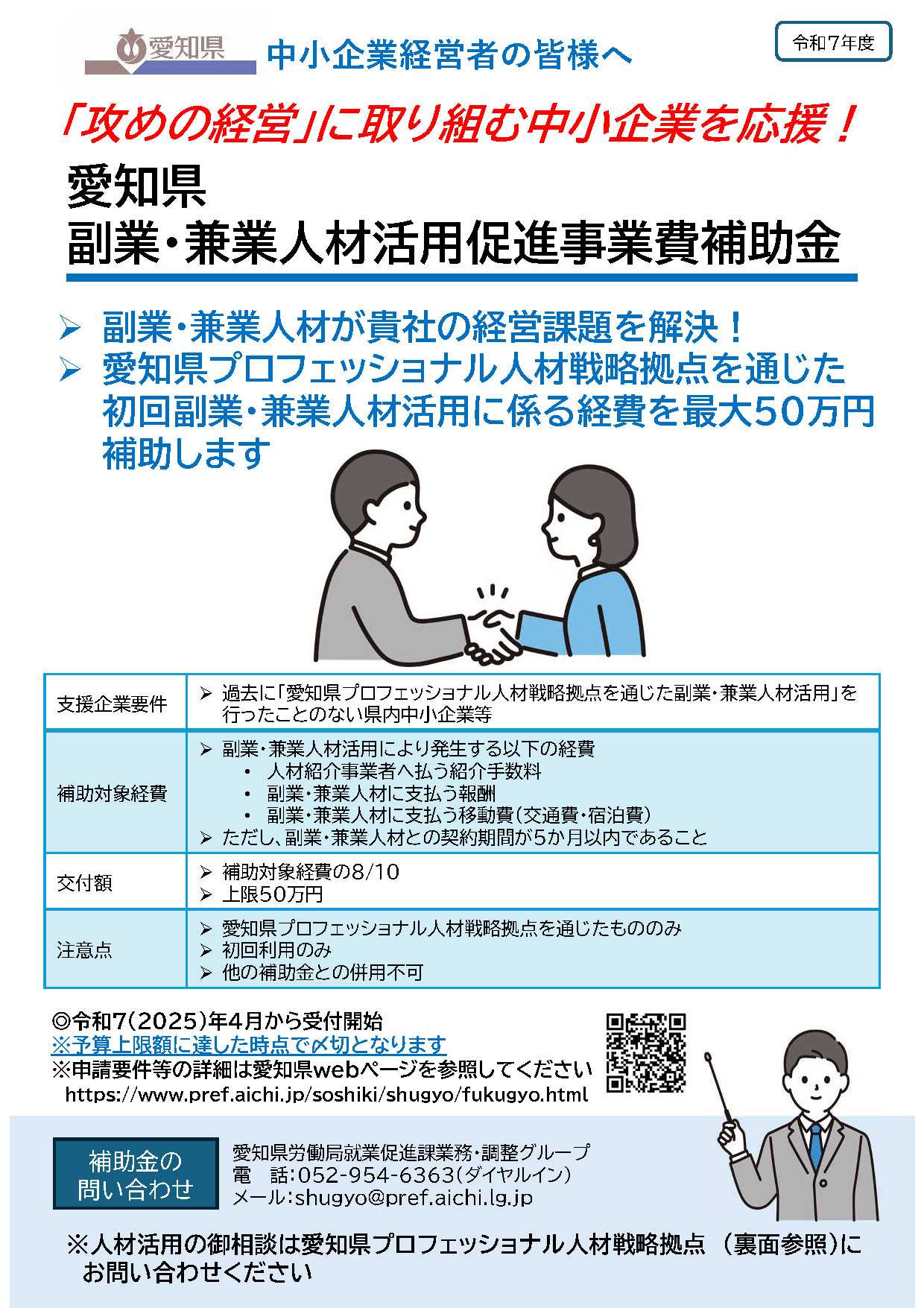 📣 中小企業の皆さまへ「新しい発想を取り入れたい」「専門スキルを一時的に活用したい」そんな企業の皆さまを、愛知県が全力でサポートします!💡 副業・兼業人材活用促進事業費補助金初めて副業・兼業人材を活用する県内中小企業を対象に、最大50万円を補助します。人材紹介手数料や報酬、交通費・宿泊費などが対象です。相談・申請の第一歩は、「愛知県プロフェッショナル人材戦略拠点」へ。経営課題を整理し、最適な人材とのマッチングをサポートします。📍詳細はこちら▶ https://www.pref.aichi.jp/soshiki/shugyo/fukugyo.html📍人材相談窓口▶https://www.aichi-projinzai.jp/経営の転換期を迎える今こそ、副業・兼業人材の力で“攻めの経営”を実現しませんか?#愛知県 #中小企業支援 #副業人材 #兼業人材 #経営課題解決 #地域人材活用 #プロ人材戦略拠点 #ワークシフト #経営革新