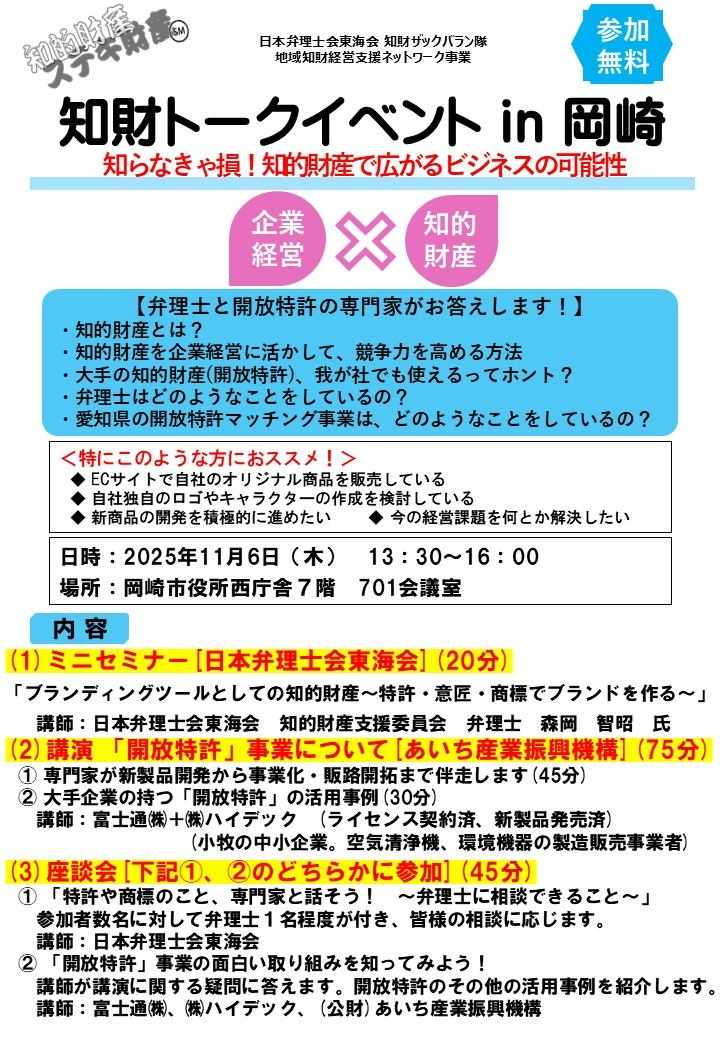 弁理士や開放特許の専門家が、企業経営に役立つ“知財の実践活用”を分かりやすく紹介!特許・意匠・商標をブランドづくりや商品開発にどう活かすか、また大手企業の開放特許をどのように自社の成長に取り入れられるかを学べます。🔹日 時:2025年11月6日(木)13:30〜16:00🔹会 場:岡崎市役所 西庁舎7階 701会議室🔹定 員:30名(先着順)🔹参加費:無料🔹申込締切:10月30日(木)セミナーでは、日本弁理士会東海会、富士通㈱、㈱ハイテック、(公財)あいち産業振興機構の専門家が登壇。後半には弁理士との座談会もあり、実際に質問・相談が可能です。💡こんな方におすすめ・ECサイトなどで自社ブランドを展開している方・自社オリジナル商品の開発を進めたい方・知的財産の基本を学びたい方👉詳細・申込はこちらhttps://www.pref.aichi.jp/press-release/aichi-chizai/salon2025.html