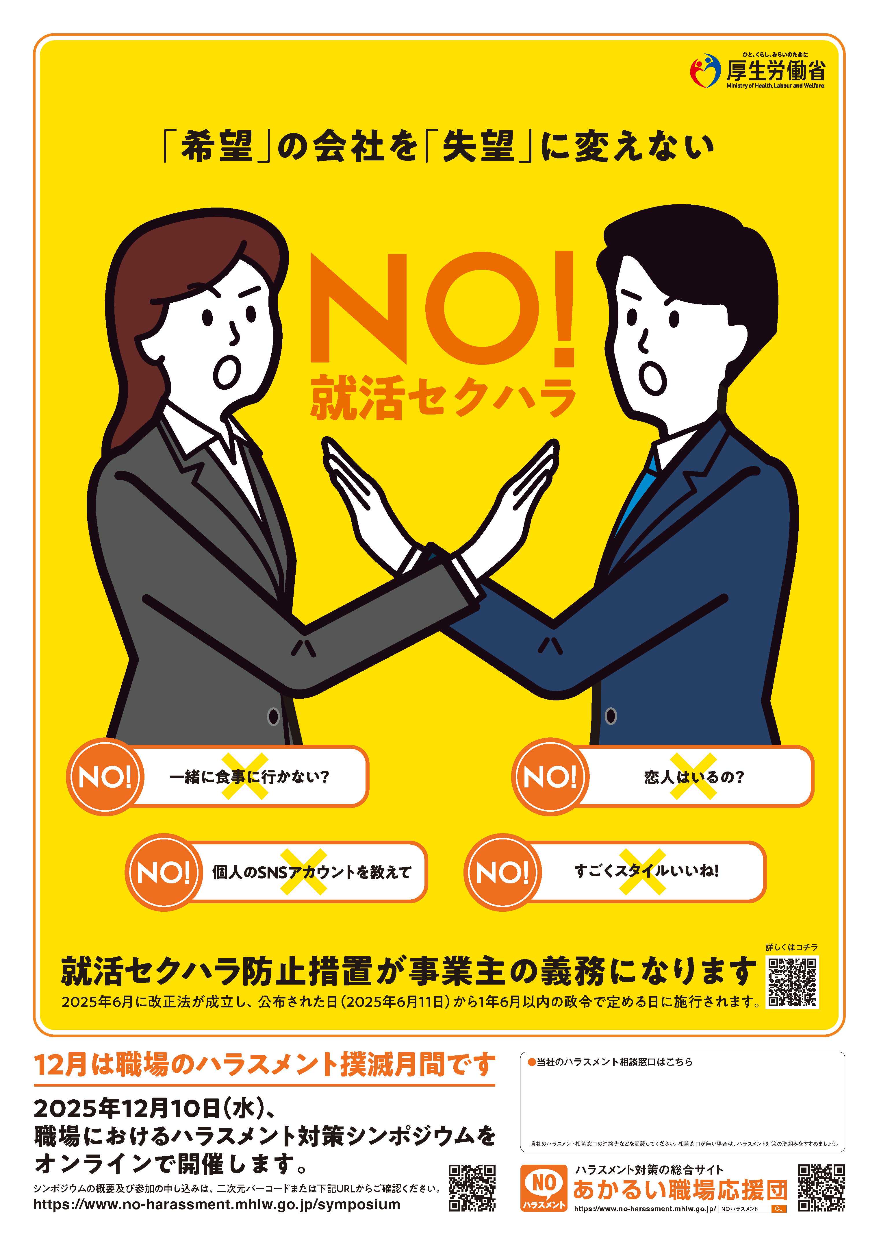 働くすべての皆さまへ12月は「職場のハラスメント撲滅月間」です。ハラスメントは、従業員のメンタルヘルスや就業継続に深刻な影響を与えるだけでなく、企業の信頼性や生産性を低下させるリスクにもつながります。「職場のハラスメントを決して許さない文化」を社会全体で築くため、事業主には、ハラスメントを防止するための措置を講ずることが義務付けられています。🔸義務として求められる主なポイント・就業規則や方針の明確化、周知徹底・相談窓口の設置、対応体制の整備・被害者・行為者双方への適切なケア・事業主の責務としての再発防止厚生労働省・愛知労働局では、セクション別の情報提供や対策支援、相談窓口の案内など、職場づくりの取り組みを応援しています。「誰もが安心して、能力を発揮できる職場へ」今一度、社内体制の見直しや啓発にご活用ください。👇詳細はこちらhttps://jsite.mhlw.go.jp/aichi-roudoukyoku/newpage_202412011_00001.html企業の皆さまの取り組みを応援しています。一緒に「ハラスメントのない職場」を広げていきましょう。#ハラスメント対策 #職場環境改善 #就活セクハラ防止 #カスハラ防止#働き方改革 #愛知労働局