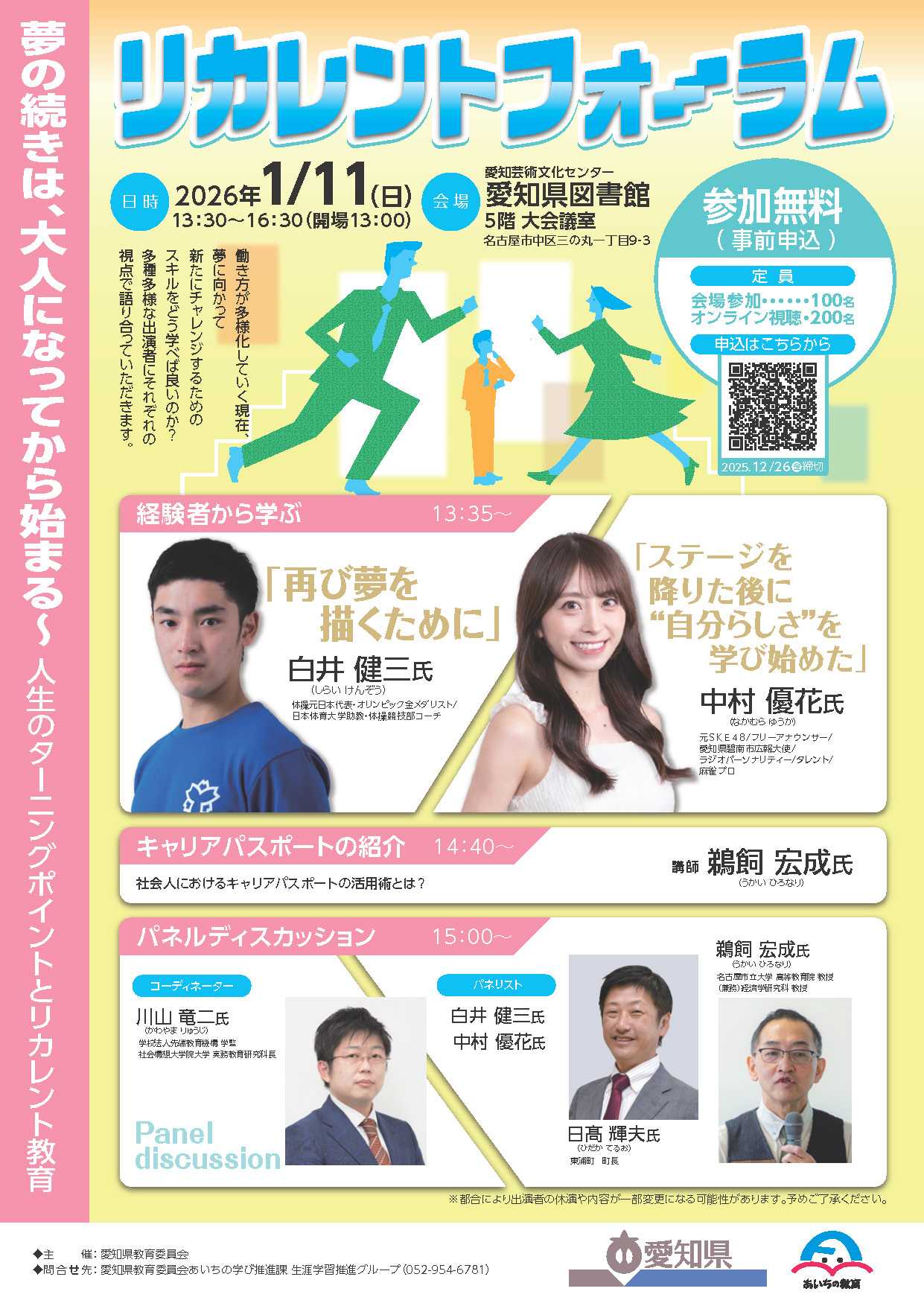 社会人として多忙な毎日を送る中、ふと「このままで良いのだろうか」「もう一度学び直したい」と感じたことはないでしょうか?働き方が多様化し、ライフステージが変化する中で、学び直し(リカレント教育)やキャリア再設計の重要性が高まっています。そんな今、愛知県が贈る「リカレントフォーラム」が、あなたの“次の一歩”を後押しします。なぜ今、リカレントなのか? – 働き方の変化、キャリア寿命の延長、スキルのアップデート、人生100年時代… – 大人になってから「夢の続き」を描くことの意義。 フォーラムの魅力 – 登壇者紹介: ・白井 健三氏(体操元日本代表・五輪金/日体大助教・体操競技部コーチ)…幼少期からオリンピックを目指し、引退後も教育・指導の場で活躍。再び夢を描くための軌跡。 ・中村 優花氏(元SKE48/フリーアナ/碧南市広報大使/ラジオ・タレント・麻雀プロ)…一線を降りてから「自分らしさ」を模索。キャリア転換のリアル。 ・鵜飼 宏成氏(名市大 高等教育院教授/大学院経済学研究科教授)…リカレント教育・成人ラーニングのプロ。制度・実践両面から解説。 ・日髙 輝夫氏(東浦町長)…地域×人材育成の観点から、働き手の視点と地域活性化の視点を語る。 ・コーディネーター:川山 竜二氏(学校法人先端教育機構 学監/社会構想大学院大学 実務教育研究科長)…キャリア支援・教育構造の専門家として議論をリード。 プログラム概要 – 13:35〜 経験者から学ぶセッション(白井氏/中村氏) – 14:40〜 キャリアパスポート紹介(鵜飼氏) – 15:00〜 パネルディスカッション(コーディネーター:川山氏/パネリスト:登壇者+日髙氏) 参加メリット – 自分のキャリアを振り返り、次を描くヒントが得られる。 – リカレント教育を「知る」「活かす」ための実践的情報。 – 会場・オンライン対応なので、地理・時間に縛られず参加可能。 参加方法・申込詳細 – 日時:2026年1月11日(日)13:30〜16:30(開場13:00) – 会場:愛知県図書館 5階大会議室(名古屋市中区三の丸1丁目9-3) – 参加費:無料(事前申込制/定員:会場100名・オンライン200名) – 申込締切:2025年12月26日(金) – 詳細・申込フォーム: https://www.pref.aichi.jp/press-release/recurrent2025.html 最後にひとこと “学びは若い時だけのもの?”いいえ、むしろ「大人になってから」が本番です。働きながら、人生を重ねながら、“夢の続き”を描きませんか? このフォーラムが、その第一歩になるかもしれません。