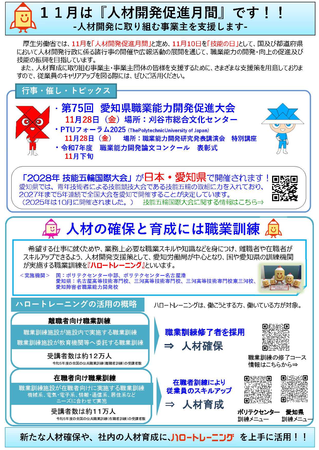 厚生労働省では、11月10日の「技能の日」を中心に、国・都道府県が連携して人材育成や職業能力開発の取組を推進しています。企業・団体の皆さまの人材育成への取組を支援するため、様々な制度・行事・研修が実施されています。🔹主な行事第75回 愛知県職業能力開発促進大会(11月28日/刈谷市総合文化センター)PTUフォーラム2025(同日開催)職業能力開発論文コンクール表彰式(11月下旬)また、2028年には「技能五輪国際大会」が日本・愛知県で開催予定!若年技能者の育成や技術力の継承を全国的に後押ししています。🔹職業訓練で人材を育てる ―「ハロートレーニング」―希望の仕事に就くため、または社内でのスキルアップのために、職業訓練を通じて専門的な技能・知識を身につけることができます。離職者・在職者を問わず受講が可能で、・受講者の年間総数は約12万人(離職者訓練)・在職者訓練は約1万人が参加と、多くの方に活用されています。企業の皆様は、職業訓練修了者の採用や在職者訓練による人材育成に、ぜひご活用ください。👉 詳細・申込:https://jsite.mhlw.go.jp/aichi-roudoukyoku/kunren-jinzai202511.html🔹デジタル人材育成支援制度(参加無料)AI・データ活用、業務効率化など、DXに向けたオーダーメイド型の研修も支援!中小企業等におけるDX人材育成を目的に、説明会・相談会を毎月開催しています。参加費は無料。ポリテクセンター中部・愛知労働局講師がサポートします。📞問合せ先:厚生労働省・愛知労働局・ハローワーク職業安定部訓練課 TEL:052-688-5755#人材開発促進月間 #愛知労働局 #ハロートレーニング #DX人材育成 #職業訓練 #人材育成 #スキルアップ #企業支援