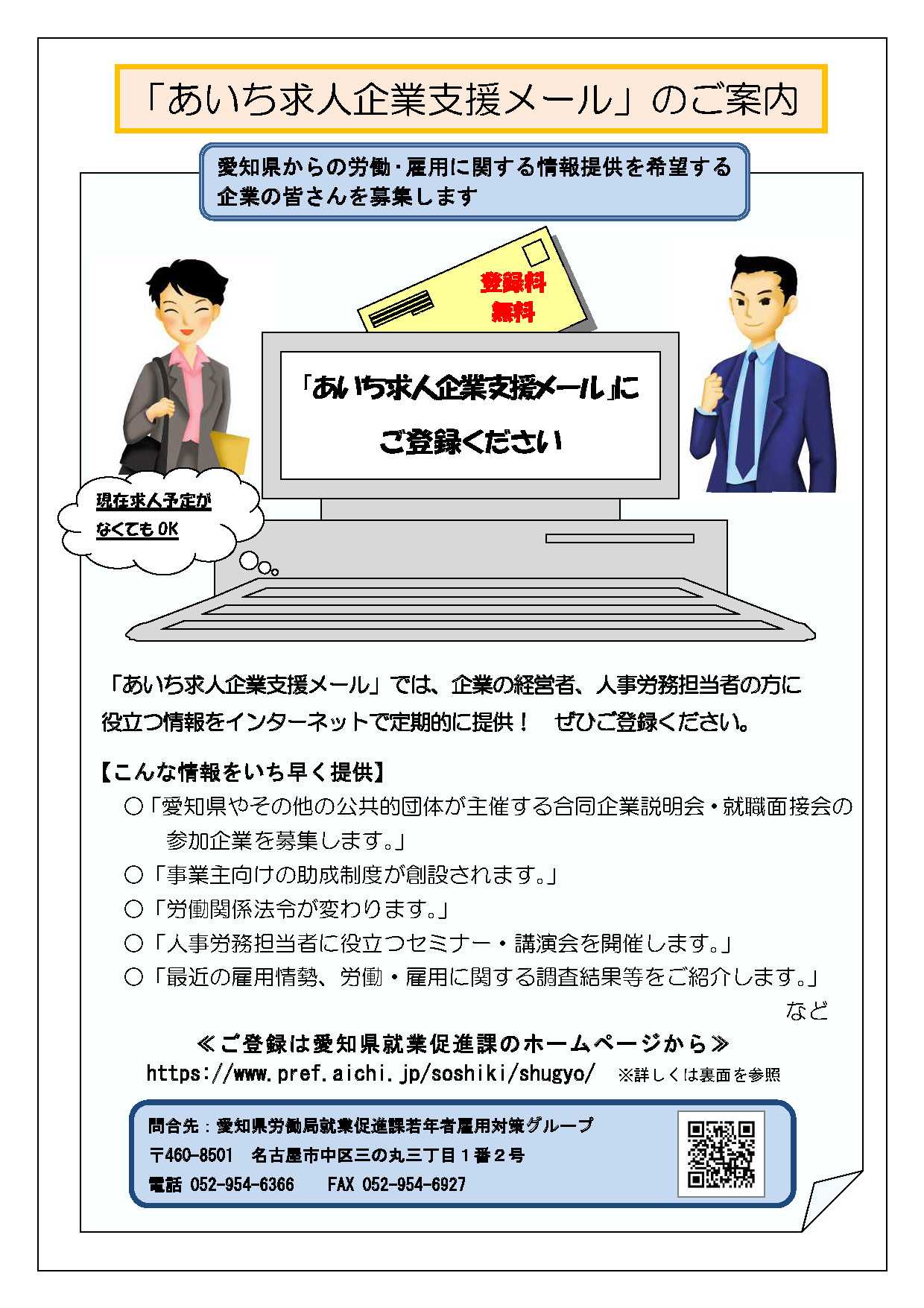 愛知県では、県内企業の皆さまに向けて、労働・雇用に関する最新情報をメールでお届けしています。登録料・利用料はすべて【無料】!現在、求人予定がない企業の方でも登録OKです。💡配信内容(一例)・愛知県や公共団体が主催する企業説明会・就職面接会のご案内・新設・拡充された助成制度情報・労働関係法令の改正ポイント・人事労務担当者向けセミナー・講演会の案内・雇用・労働に関する最新調査結果の紹介 など📨 登録は簡単3ステップ!① 愛知県就業促進課ホームページにアクセス② 「あいち求人情報支援メール登録はこちら!」をクリック③ 必要事項を入力して送信👉 詳しくはこちら🔗 https://www.pref.aichi.jp/soshiki/shugyo/0000035386.html人事・労務に関する最新の動きをキャッチするために、ぜひご登録ください!
