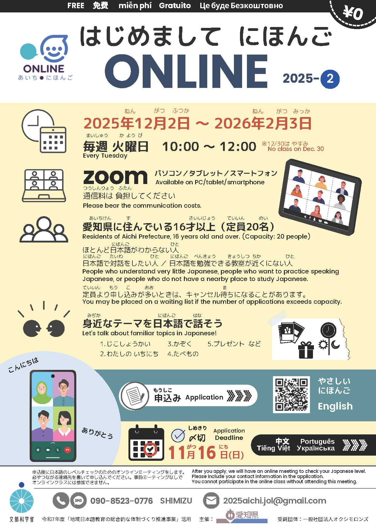 愛知県では、多文化共生の取組の一環として、在住外国人の方々を対象にした「オンライン日本語教室(後期)」を開催します。スマートフォンやパソコンで、自宅から気軽に日本語を学べる人気の講座です。📍【特徴】・Zoomでオンライン授業(全12回)・初級・中級のレベル別クラスで安心・ボランティア講師との交流を通じて楽しく学べる・受講料は無料📅【実施期間】2025年11月~2026年2月💬「日本語で話したい」「もっと生活を楽しみたい」そんな想いを応援します。📎詳しくはこちら👉 https://www.pref.aichi.jp/press-release/tabunka-online-nihongo20251020.html🌏多文化共生情報ページ👉 https://www.pref.aichi.jp/syakaikatsudo/tabunka/#愛知県 #多文化共生 #日本語教室 #オンライン講座 #JapaneseLearning #あいちのやさしい日本語