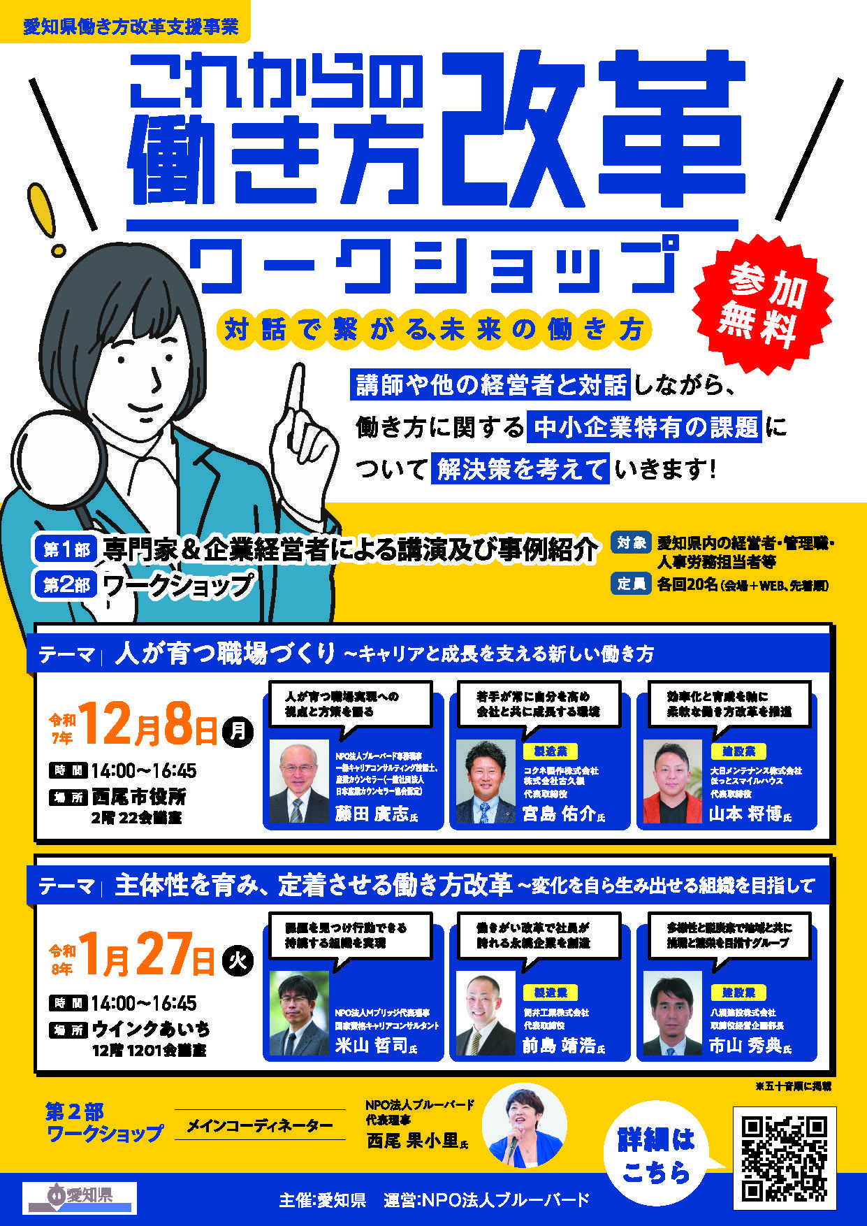 働き方改革は、法律対応だけではありません。一人ひとりがやりがいを感じ、長く働ける職場づくり。愛知県では、経営者や人事担当者を対象に「これからの働き方改革ワークショップ」を開催します。💬 講師には、現場で実践を重ねる専門家と経営者が登壇!▶【第1回】12月8日(月) 西尾市役所テーマ:「人が育つ職場づくり ~キャリアと成長を支える新しい働き方~」登壇:藤田 廣志 氏(NPO法人ブルーバード専務理事/一級キャリアコンサルティング技能士) 宮島 佑介 氏(コクネ製作/古久根 代表取締役) 山本 将博 氏(大日メンテナンス/ほっとスマイルハウス 代表取締役)▶【第2回】1月27日(火) ウインクあいちテーマ:「主体性を育み、定着させる働き方改革」登壇:米山 哲司 氏(Mブリッジ 代表理事/国家資格キャリアコンサルタント) 前島 靖浩 氏(筒井工業 代表取締役) 市山 秀典 氏(八洲建設 取締役経営企画部長)💻 会場・オンラインどちらでも参加OK💰 参加無料(先着順)「他の会社はどうしているの?」「うちにもできることがあるかも」そんな気づきが、職場を変える第一歩です。🔗 詳細・お申込みはこちらhttps://www.pref.aichi.jp/press-release/workshop2025.html#働き方改革 #愛知県 #西尾市 #名古屋 #ウインクあいち #中小企業支援 #職場改善 #人材育成 #定着支援 #ブルーバード